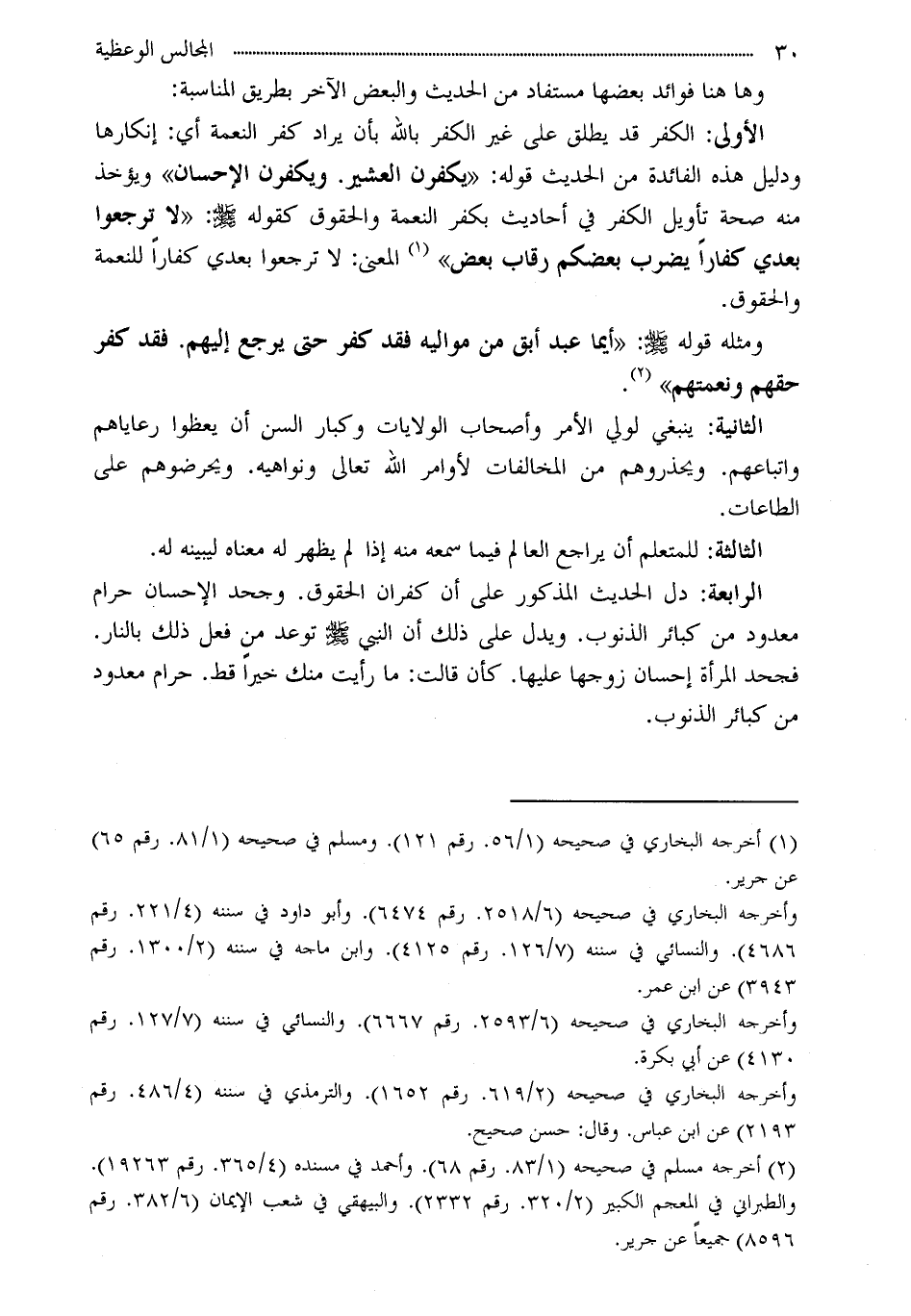 الرابعة: دل الحديث المذكور على أن كفران الحقوق. وجحد الإحسان حرام معدود من كبائر الذنوب. ويدل على ذلك أن النبي - صلى الله عليه وسلم - توعد من فعل ذلك بالنار. فجحد المرأة إحسان زوجها عليها. كأن قالت: ما رأيت منك خيراً قط. حرام معدود من كبائر الذنوب.