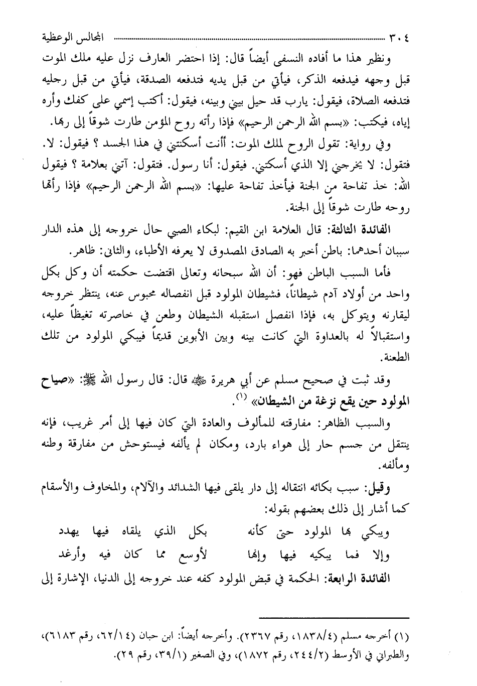 وقد ثبت في صحيح مسلم عن أبي هريرة - رضي الله عنه - قال: قال رسول الله - صلى الله عليه وسلم -: «صياح المولود حين يقع نزغة من الشيطان» (¬1) .