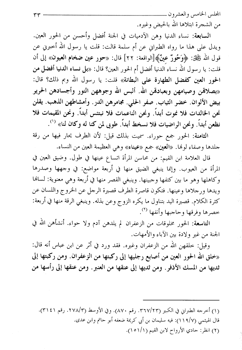 السابعة: نساء الدنيا وهن الآدميات في الجنة أفضل وأحسن من الحور العين. ويدل على هذا ما رواه الطبراني عن أم سلمة قالت: قلت يا رسول الله أخبرني عن قول الله - عز وجل -: ?وَحُورٌ عِينٌ? [الواقعة: 22] قال: «حور عين ضخام العيون» إلى أن قلت: يا رسول الله نساء الدنيا أفضل أم الحور العين؟ قال: «بل نساء الدنيا أفضل من الحور العين كفضل الطهارة على البطانة» قلت: يا رسول الله وبم ذلك؟ قال: «بصلاتهن وصيامهن وبعبادتهن الله. ألبس الله وجوههن النور وأجسادهن الحرير بيض الألوان. خضر الثياب. صفر الحلي. مجامرهن الدر. وأمشاطهن الذهب. يقلن نحن الخالدات فلا نموت أبداً. ونحن الناعمات فلا نبتئس أبداً. ونحن المقيمات فلا نظعن أبداً. ونحن الراضيات فلا نسخط أبداً. طوبى لمن كنا له وكان لنا» (¬1) .