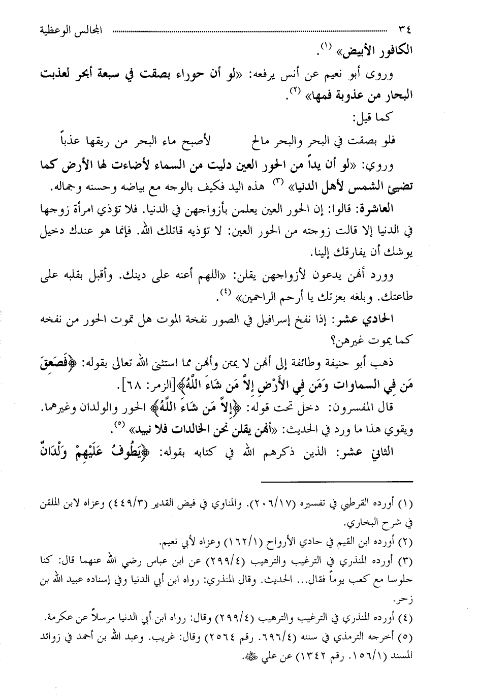 وروي: «لو أن يداً من الحور العين دليت من السماء لأضاءت لها الأرض كما تضيئ الشمس لأهل الدنيا» (¬3) هذه اليد فكيف بالوجه مع بياضه وحسنه وجماله.