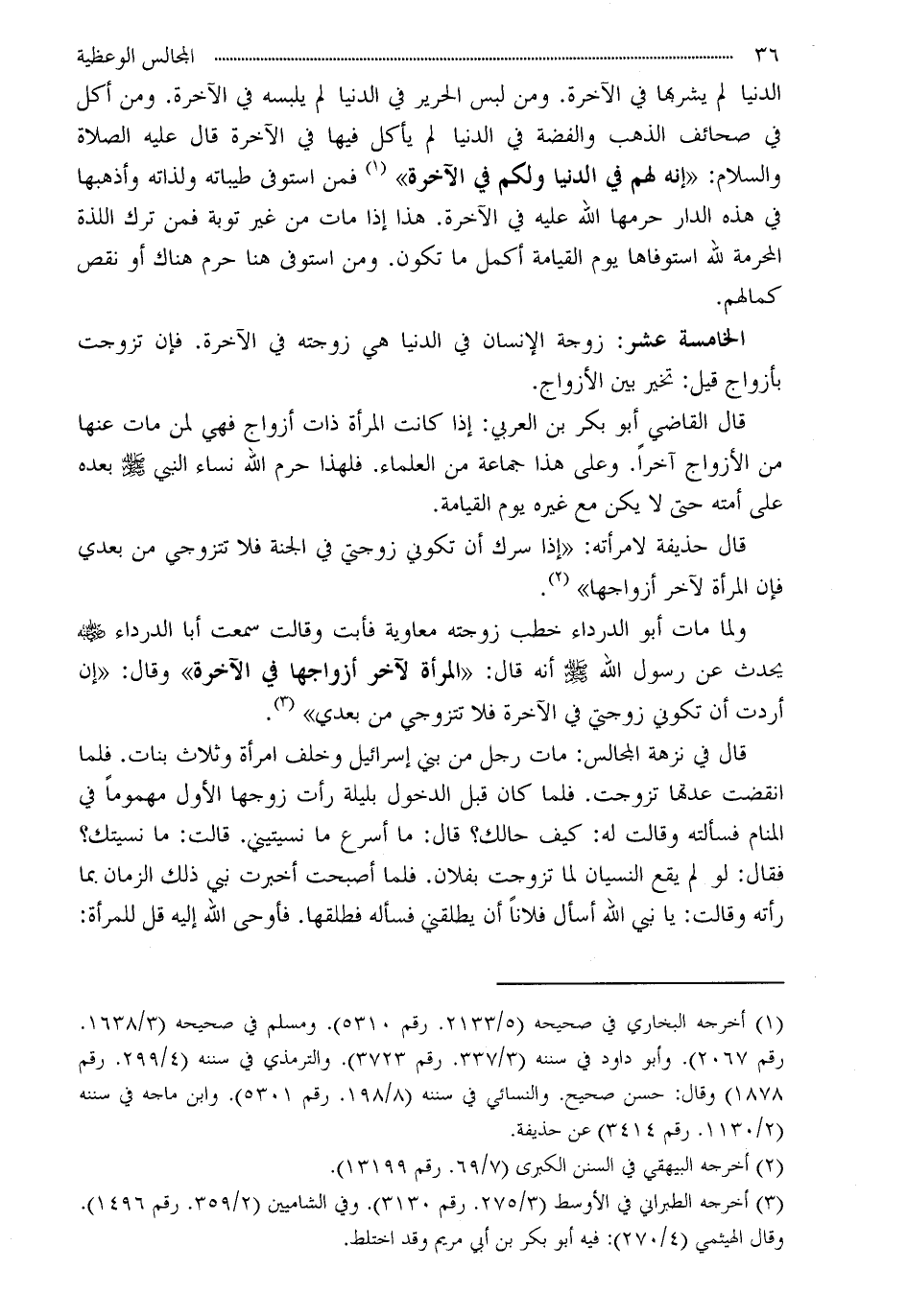 ولما مات أبو الدرداء خطب زوجته معاوية فأبت وقالت سمعت أبا الدرداء - رضي الله عنه - يحدث عن رسول الله - صلى الله عليه وسلم - أنه قال: «المرأة لآخر أزواجها في الآخرة» وقال: «إن أردت أن تكوني زوجتي في الآخرة فلا تتزوجي من بعدي» (¬3) .