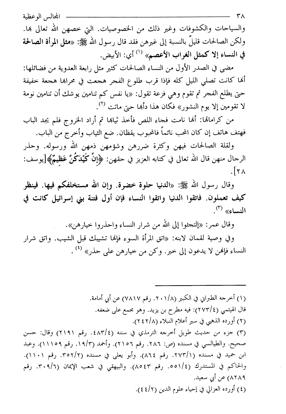 والسياحات والكشوفات وغير ذلك من الخصوصيات. التي خصهن الله تعالى بها. ولكن الصالحات قليلٌ بالنسبة إلى غيرهن فقد قال رسول الله - صلى الله عليه وسلم -: «مثل المرأة الصالحة في النساء إلا كمثل الغراب الأعصم» (¬1) أي: الأبيض.