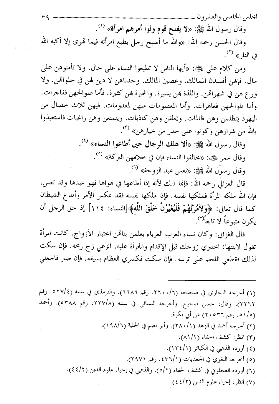 قال الغزالي رحمه الله: فإنما ذلك لأنه إذا أطاعها في هواها فهو عبدها وقد تعس. فإن الله ملكه المرأة فملكها نفسه. فإذا ملكها نفسه فقد عكس الأمر وأطاع الشيطان كما قال تعالى: ?وَلآمُرَنَّهُمْ فَلَيُغَيِّرُنَّ خَلْقَ اللَّهِ? [النساء: 114] إذ حق الرجل أن يكون متبوعاً لا تابعاً (¬7) .