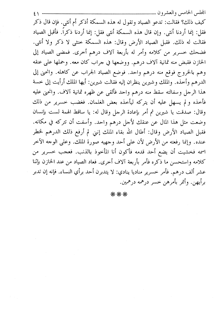 كيف ذلك؟ فقالت: تدعو الصياد وتقول له هذه السمكة أذكر أم أنثى. فإن قال ذكر فقل: إنما أردنا أنثى. وإن قال هذه السمكة أنثى فقل: إنما أردنا ذكراً. فأقبل الصياد فقالت له ذلك. فقبل الصياد الأرض وقال: هذه السمكة خنثى لا ذكر ولا أنثى. فضحك خسرير من كلامه وأمر له بأربعة آلاف درهم أخرى. فمضى الصياد إلى الخازن فقبض منه ثمانية آلاف درهم. ووضعها في جراب كان معه. وحملها على عنقه وهم بالخروج فوقع منه درهم واحد. فوضع الصياد الجراب عن كاهله. وانحنى إلي الدرهم وأخذه. والملك وشيرين ينظران إليه فقالت شيرين: أيها الملك أرأيت إلي خسة هذا الرجل وسفالته سقط منه درهم واحد فألقى عن ظهره ثمانية آلاف. وانحنى عليه فأخذه ولم يسهل عليه أن يتركه ليأخذه بعض الغلمان. فغضب خسرير من ذلك وقال: صدقت يا شيرين ثم أمر بإعادة الرجل وقال له: يا ساقط الهمة لست بإنسان وضعت مثل هذا المال عن عنقك لأجل درهم واحد. وأسفت أن تتركه في مكانه. فقبل الصياد الأرض وقال: أطال الله بقاء الملك إنني لم أرفع ذلك الدرهم لخطره عنده. وإنما رفعته من الأرض لأن على أحد وجهيه صورة الملك. وعلى الوجه الآخر اسمه فخشيت أن يضع أحد قدمه فأكون أنا المأخوذ بالذنب. فعجب خسرير من كلامه واستحسن ما ذكره فأمر بأربعة آلاف أخرى. فعاد الصياد من عند
