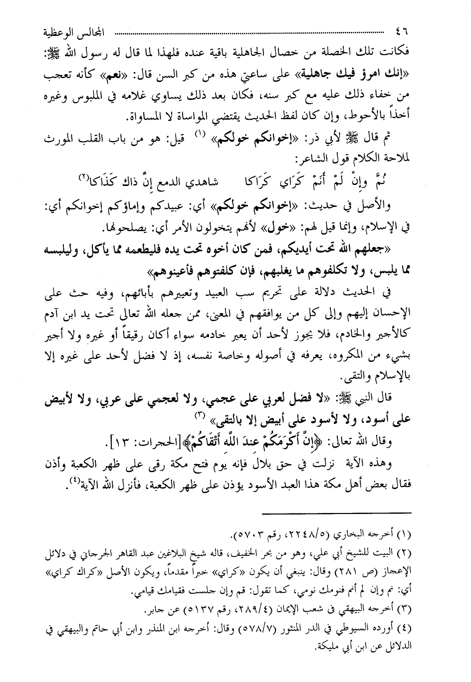 قال النبي - صلى الله عليه وسلم -: «لا فضل لعربي على عجمي، ولا لعجمي على عربي، ولا لأبيض على أسود، ولا لأسود على أبيض إلا بالتقى» (¬3)