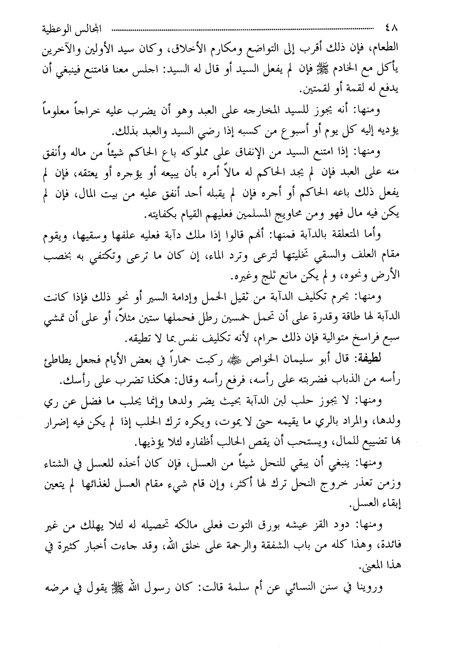 ومنها: يحرم تكليف الدآبة من ثقيل الحمل وإدامة السير أو نحو ذلك فإذا كانت الدآبة لها طاقة وقدرة على أن تحمل خمسين رطل فحملها ستين مثلاً، أو على أن تمشي سبع فراسخ متوالية فإن ذلك حرام، لأنه تكليف نفس بما لا تطيقه.