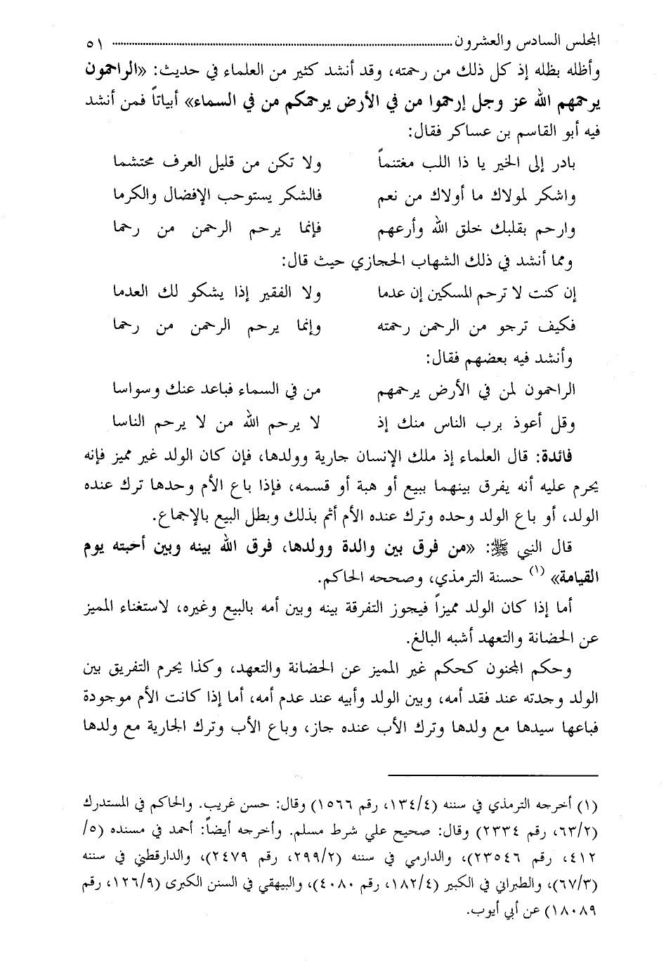 وأظله بظله إذ كل ذلك من رحمته، وقد أنشد كثير من العلماء في حديث: «الراحمون يرحمهم الله عز وجل إرحموا من في الأرض يرحمكم من في السماء» أبياتاً فمن أنشد فيه أبو القاسم بن عساكر فقال: