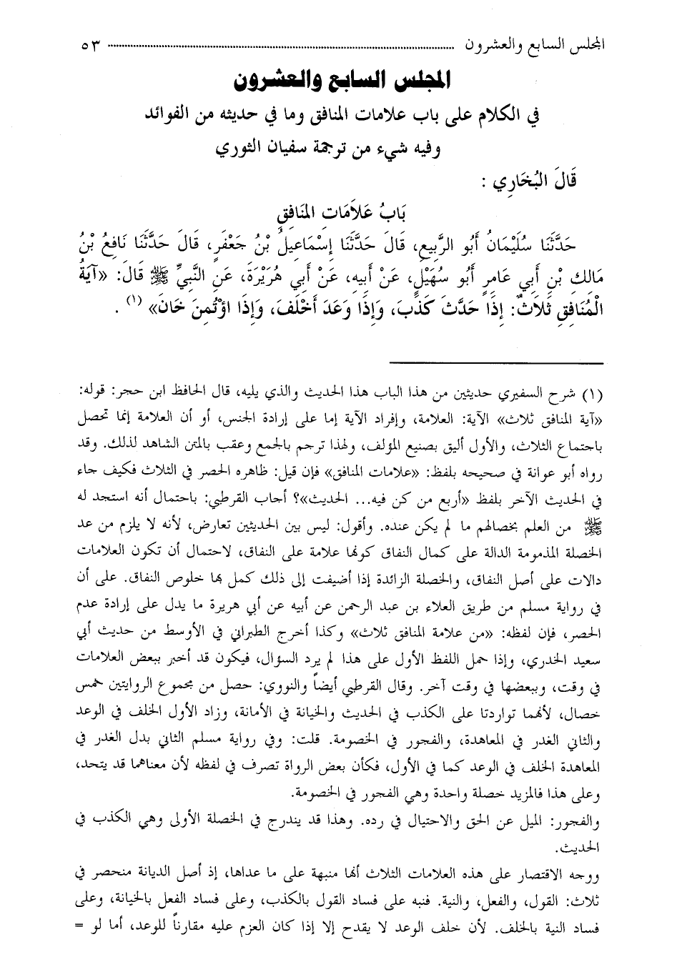 (¬1) شرح السفيري حديثين من هذا الباب هذا الحديث والذي يليه، قال الحافظ ابن حجر: قوله: «آية المنافق ثلاث» الآية: العلامة، وإفراد الآية إما على إرادة الجنس، أو أن العلامة إنما تحصل باجتماع الثلاث، والأول أليق بصنيع المؤلف، ولهذا ترجم بالجمع وعقب بالمتن الشاهد لذلك. وقد رواه أبو عوانة في صحيحه بلفظ: «علامات المنافق» فإن قيل: ظاهره الحصر في الثلاث فكيف جاء في الحديث الآخر بلفظ «أربع من كن فيه ... الحديث» ؟ أجاب القرطبي: باحتمال أنه استجد له - صلى الله عليه وسلم - من العلم بخصالهم ما لم يكن عنده. وأقول: ليس بين الحديثين تعارض، لأنه لا يلزم من عد الخصلة المذمومة الدالة على كمال النفاق كونها علامة على النفاق، لاحتمال أن تكون العلامات دالات على أصل النفاق، والخصلة الزائدة إذا أضيفت إلى ذلك كمل بها خلوص النفاق. على أن في رواية مسلم من طريق العلاء بن عبد الرحمن عن أبيه عن أبي هريرة ما يدل على إرادة عدم الحصر، فإن لفظه: «من علامة المنافق ثلاث» وكذا أخرج الطبراني في الأوسط من حديث أبي سعيد الخدري، وإذا حمل اللفظ الأول على هذا لم يرد السؤال، فيكون قد أخبر ببعض العلامات في وقت، وببعضها في وقت آخر. وقال القرطبي أيضاً والنووي: حصل من مجموع الروايتين خمس خصال، لأنهما تواردتا على الكذب في الحديث والخيانة في الأمانة، وزاد الأول الخلف في الوعد والثاني الغدر في المعاهدة، والفجور في الخصومة. قلت: وفي رواية مسلم الثاني بدل الغدر في المعاهدة الخلف في الوعد كما في الأول، فكأن بعض الرواة تصرف في لفظه لأن معناهما قد يتحد، وعلى هذا فالمزيد خصلة واحدة وهي الفجور في الخصومة.