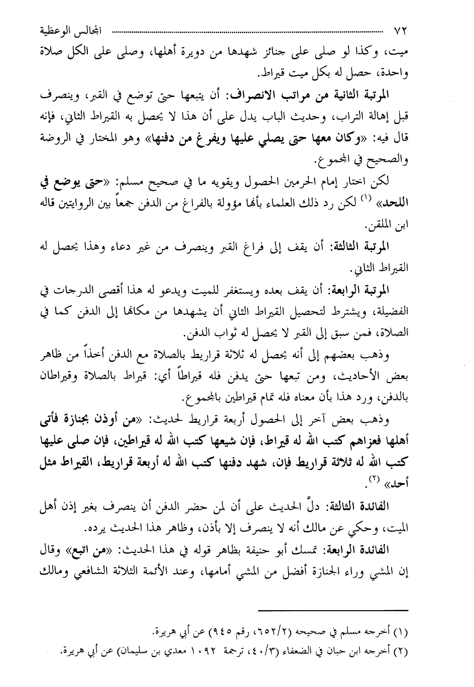 المرتبة الرابعة: أن يقف بعده ويستغفر للميت ويدعو له هذا أقصى الدرجات في الفضيلة، ويشترط لتحصيل القيراط الثاني أن يشهدها من مكانها إلى الدفن كما في الصلاة، فمن سبق إلى القبر لا يحصل له ثواب الدفن.