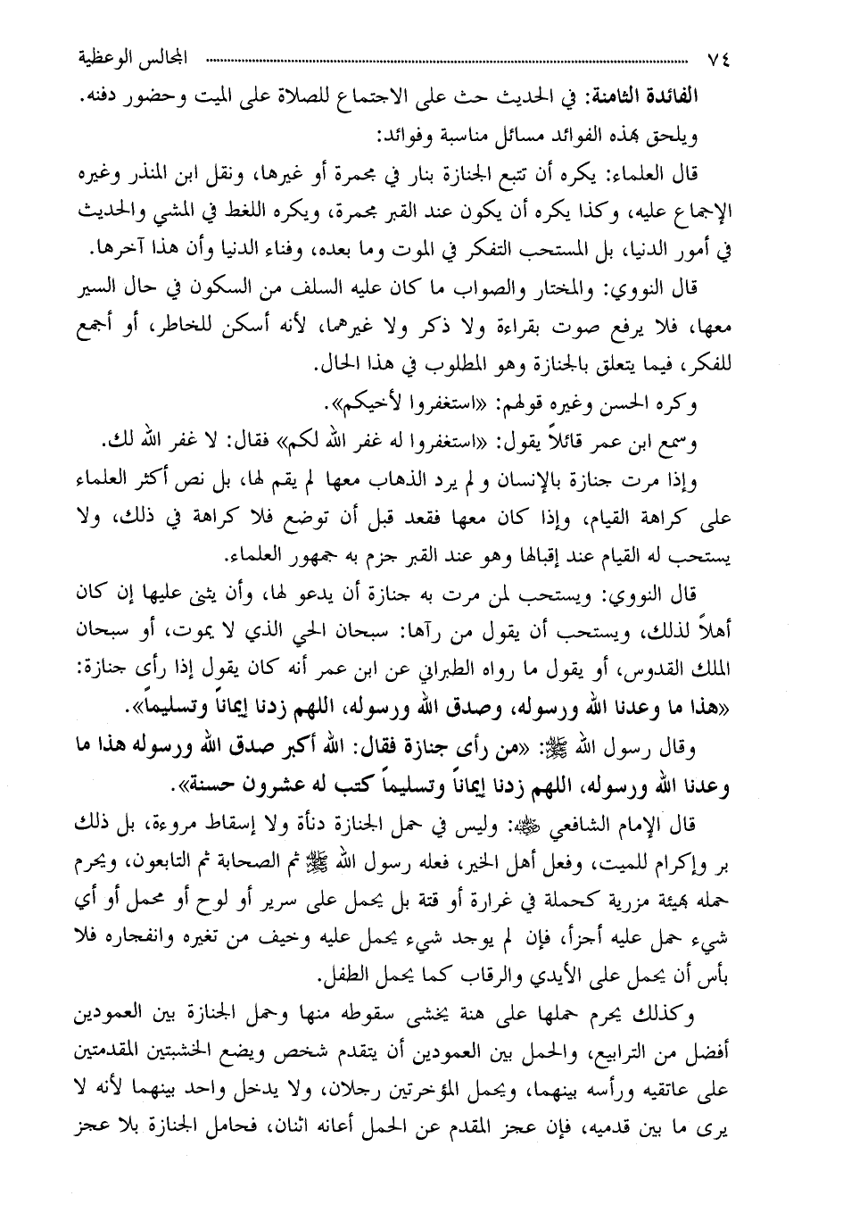 الفائدة الثامنة: في الحديث حث على الاجتماع للصلاة على الميت وحضور دفنه.