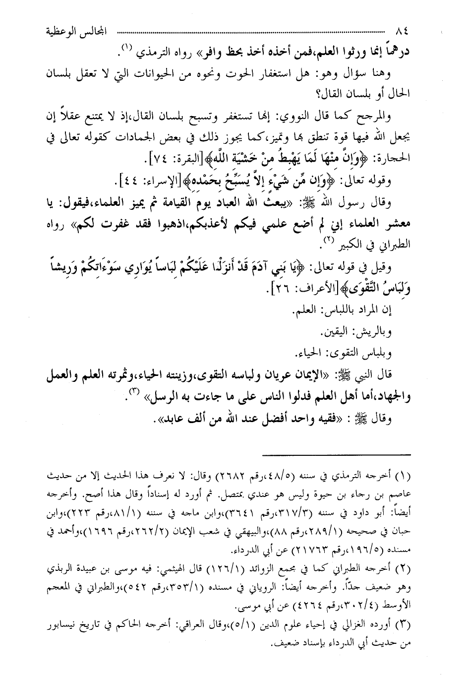 (¬3) أورده الغزالي في إحياء علوم الدين (1/5) ، وقال العراقي: أخرجه الحاكم في تاريخ نيسابور من حديث أبي الدرداء بإسناد ضعيف.