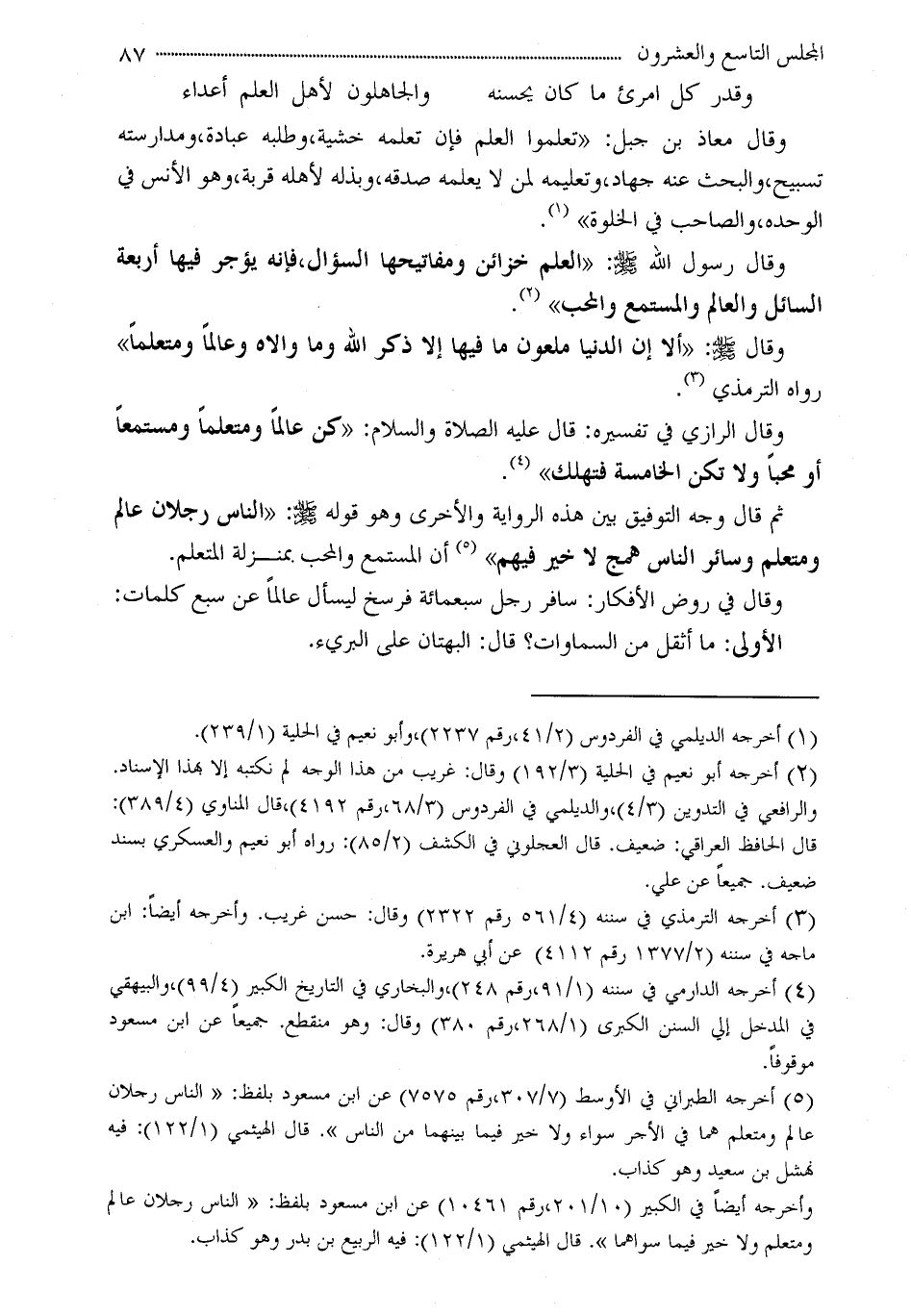 وقال الرازي في تفسيره: قال عليه الصلاة والسلام: «كن عالماً ومتعلماً ومستمعاً أو محباً ولا تكن الخامسة فتهلك» (¬4) .
