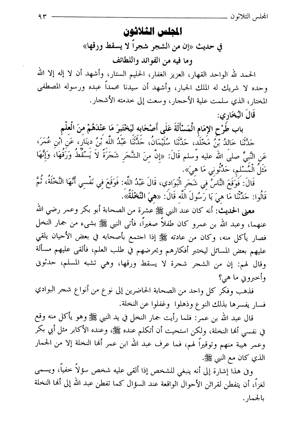 حَدَّثَنَا خَالِدُ بْنُ مَخْلَدٍ، حَدَّثَنَا سُلَيْمَانُ، حَدَّثَنَا عَبْدُ اللَّهِ بْنُ دِينَارٍ، عَنِ ابْنِ عُمَرَ، عَنِ النَّبِيِّ صلى الله عليه وسلم قَالَ: «إِنَّ مِنَ الشَّجَرِ شَجَرَةً لاَ يَسْقُطُ وَرَقُهَا، وَإِنَّهَا مَثَلُ الْمُسْلِمِ، حَدِّثُونِي مَا هِيَ» .