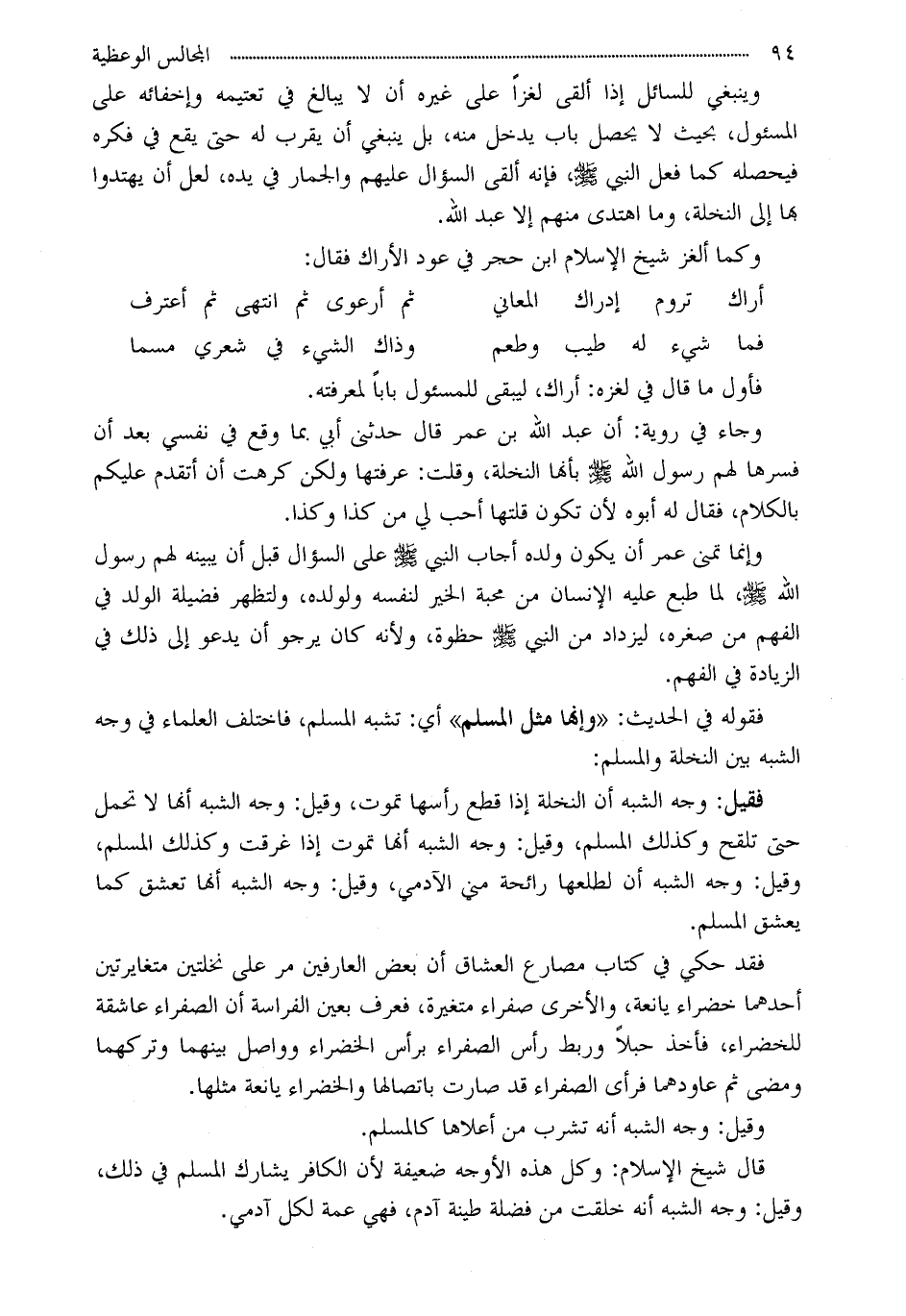 فقيل: وجه الشبه أن النخلة إذا قطع رأسها تموت، وقيل: وجه الشبه أنها لا تحمل حتى تلقح وكذلك المسلم، وقيل: وجه الشبه أنها تموت إذا غرقت وكذلك المسلم، وقيل: وجه الشبه أن لطلعها رائحة مني الآدمي، وقيل: وجه الشبه أنها تعشق كما يعشق المسلم.