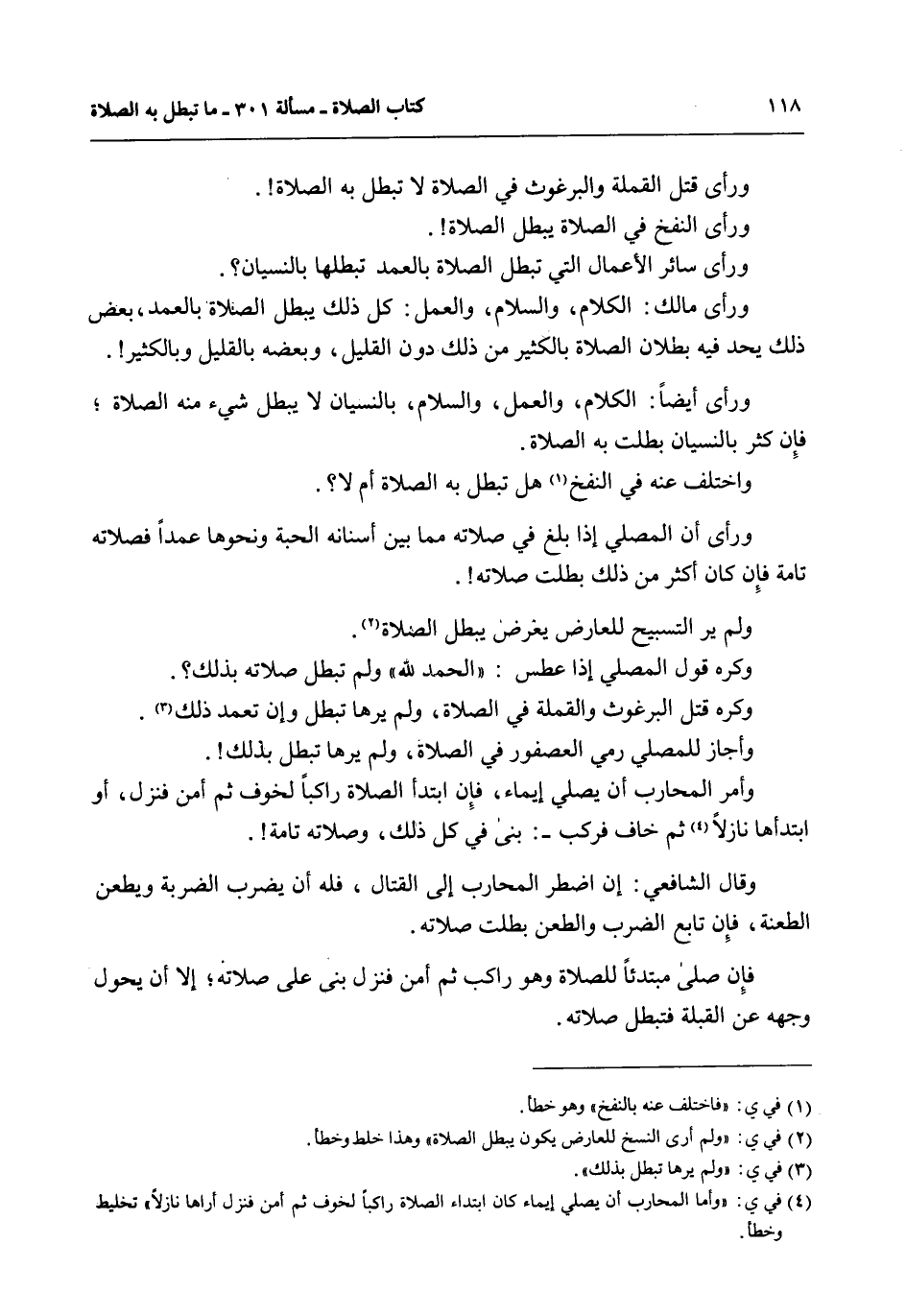 وَرَأَى مَالِكٌ: الْكَلَامَ، وَالسَّلَامَ، وَالْعَمَلَ: كُلَّ ذَلِكَ يُبْطِلُ الصَّلَاةَ بِالْعَمْدِ، بَعْضُ ذَلِكَ يَحُدُّ فِيهِ بُطْلَانَ الصَّلَاةِ بِالْكَثِيرِ مِنْ ذَلِكَ دُونَ الْقَلِيلِ، وَبَعْضُهُ بِالْقَلِيلِ وَبِالْكَثِيرِ.