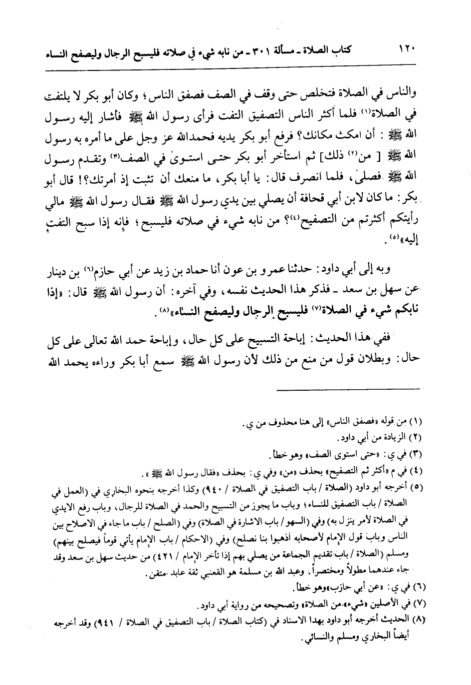 وَبِهِ إلَى أَبِي دَاوُد: حَدَّثَنَا عَمْرُو بْنُ عَوْنٍ أَنَا حَمَّادُ بْنُ زَيْدٍ عَنْ أَبِي حَازِمِ بْنِ دِينَارٍ عَنْ سَهْلِ بْنِ سَعْدٍ - فَذَكَرَ هَذَا الْحَدِيثَ نَفْسَهُ، وَفِي آخِرِهِ: أَنَّ رَسُولَ اللَّهِ - صَلَّى اللَّهُ عَلَيْهِ وَسَلَّمَ - قَالَ: «إذَا نَابَكُمْ شَيْءٌ فِي الصَّلَاةِ فَلْيُسَبِّحْ الرِّجَالُ وَلْيُصَفِّحْ النِّسَاءُ» .