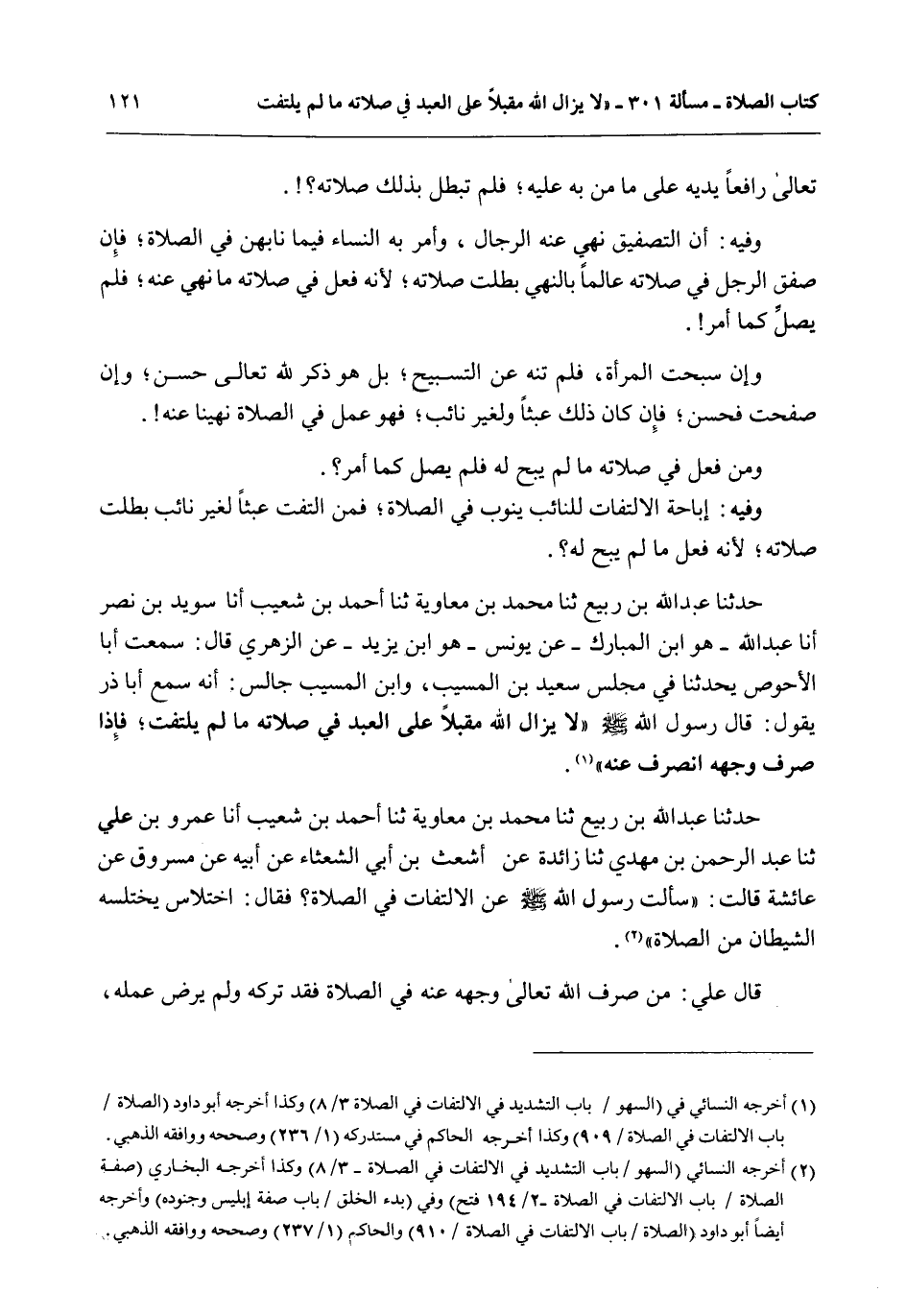 حَدَّثَنَا عَبْدُ اللَّهِ بْنُ رَبِيعٍ ثنا مُحَمَّدُ بْنُ مُعَاوِيَةَ ثنا أَحْمَدُ بْنُ شُعَيْبٍ أَنَا سُوَيْدُ بْنُ نَصْرٍ أَنَا عَبْدُ اللَّهِ هُوَ ابْنُ الْمُبَارَكِ - عَنْ يُونُسَ هُوَ ابْنُ يَزِيدَ - عَنْ الزُّهْرِيِّ قَالَ: سَمِعْت أَبَا الْأَحْوَصِ يُحَدِّثُنَا فِي مَجْلِسِ سَعِيدِ بْنِ الْمُسَيِّبِ، وَابْنُ الْمُسَيِّبِ جَالِسٌ: أَنَّهُ سَمِعَ أَبَا ذَرٍّ يَقُولُ: قَالَ رَسُولُ اللَّهِ - صَلَّى اللَّهُ عَلَيْهِ وَسَلَّمَ - «لَا يَزَالُ اللَّهُ مُقْبِلًا عَلَى الْعَبْدِ فِي صَلَاتِهِ مَا لَمْ يَلْتَفِتْ فَإِذَا صَرَفَ وَجْهَهُ انْصَرَفَ عَنْهُ» .