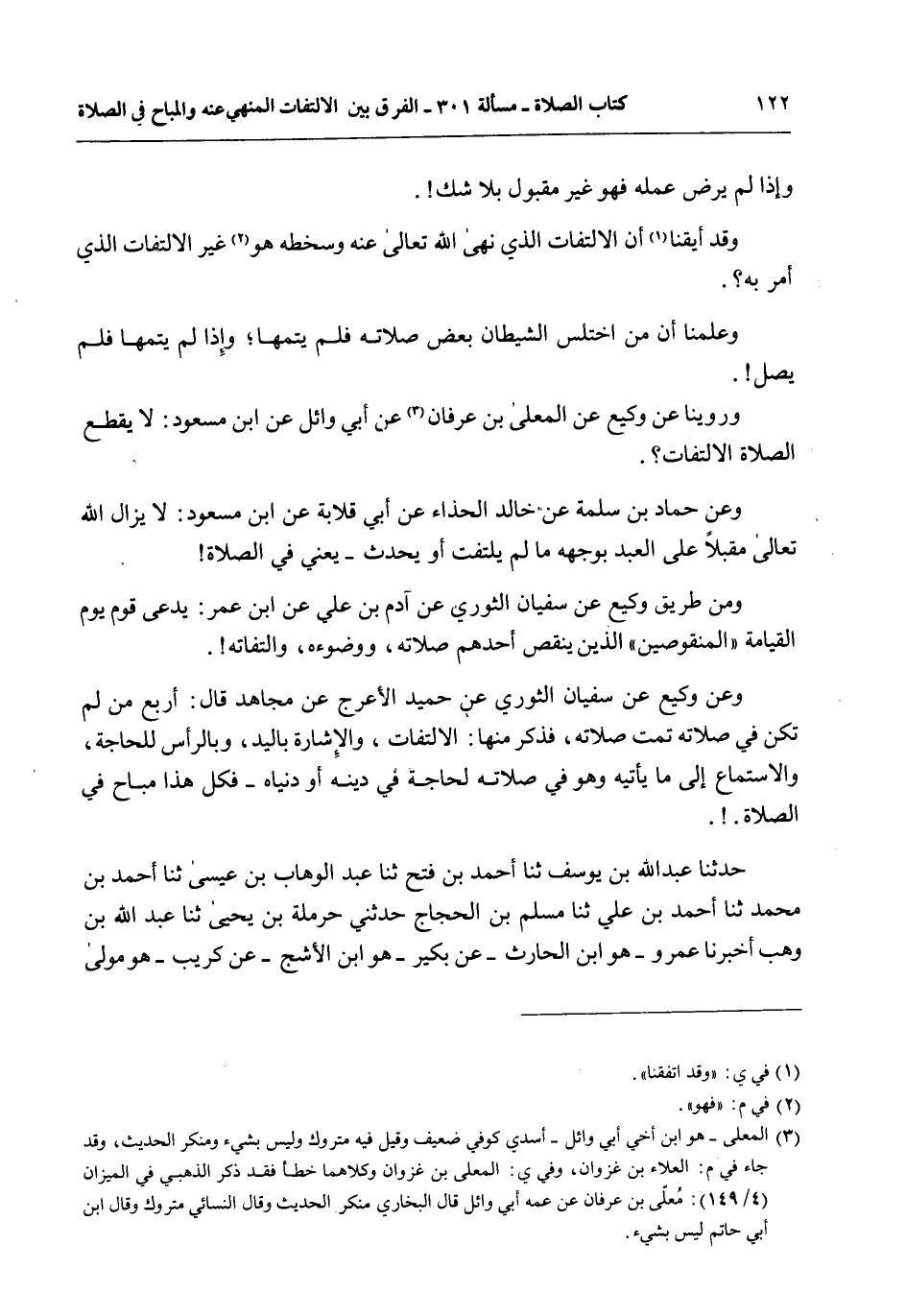 وَرُوِّينَا عَنْ وَكِيعٍ عَنْ الْمُعَلَّى بْنِ عِرْفَانَ عَنْ أَبِي وَائِلٍ عَنْ ابْنِ مَسْعُودٍ: لَا يَقْطَعُ الصَّلَاةَ الِالْتِفَاتُ؟ .