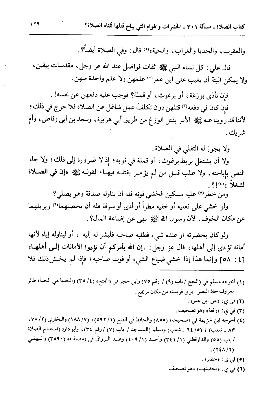 وَمَنْ خَطَرَ عَلَيْهِ مِسْكِينٌ فَخَشِيَ فَوْتَهُ فَلَهُ أَنْ يُنَاوِلَهُ صَدَقَةً وَهُوَ يُصَلِّي؟ وَلَوْ خَشِيَ عَلَى نَعْلَيْهِ أَوْ خُفَّيْهِ مَطَرًا أَوْ أَذًى أَوْ سَرِقَةً فَلَهُ أَنْ يُحَصِّنَهُمَا وَيُزِيلَهُمَا عَنْ مَكَانِ الْخَوْفِ؛ لِأَنَّ رَسُولَ اللَّهِ - صَلَّى اللَّهُ عَلَيْهِ وَسَلَّمَ - نَهَى عَنْ إضَاعَةِ الْمَالِ؟ .