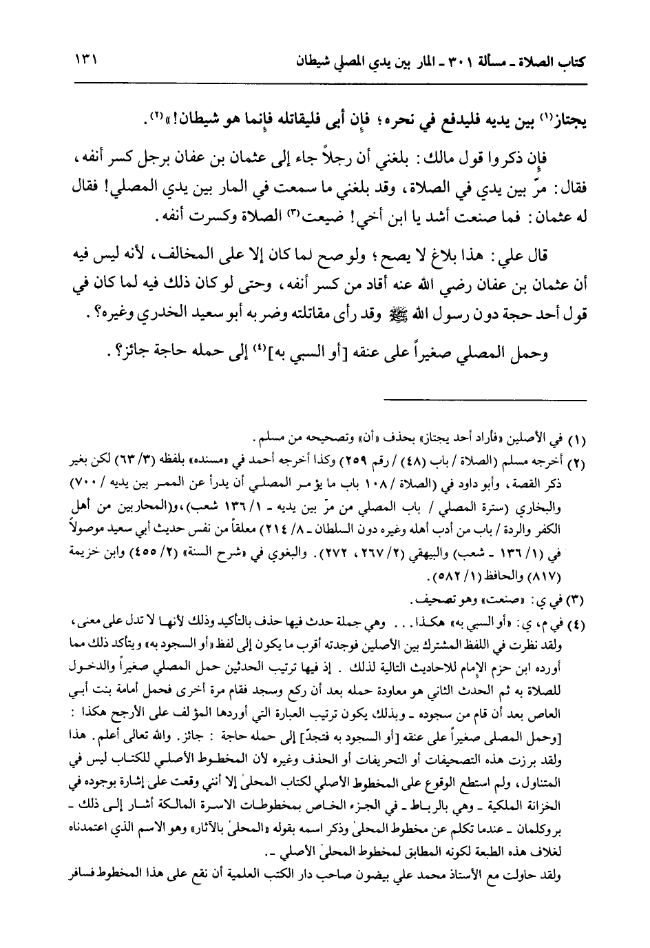 فَإِنْ ذَكَرُوا قَوْلَ مَالِكٍ: بَلَغَنِي أَنَّ رَجُلًا جَاءَ إلَى عُثْمَانَ بْنِ عَفَّانَ بِرَجُلٍ كُسِرَ أَنْفُهُ، فَقَالَ: مَرَّ بَيْنَ يَدَيَّ فِي الصَّلَاةِ، وَقَدْ بَلَغَنِي مَا سَمِعْت فِي الْمَارِّ بَيْنَ يَدَيْ الْمُصَلِّي فَقَالَ لَهُ عُثْمَانُ: فَمَا صَنَعْت أَشَدَّ يَا ابْنَ أَخِي ضَيَّعْت الصَّلَاةَ، وَكَسَرْت أَنْفَهُ.