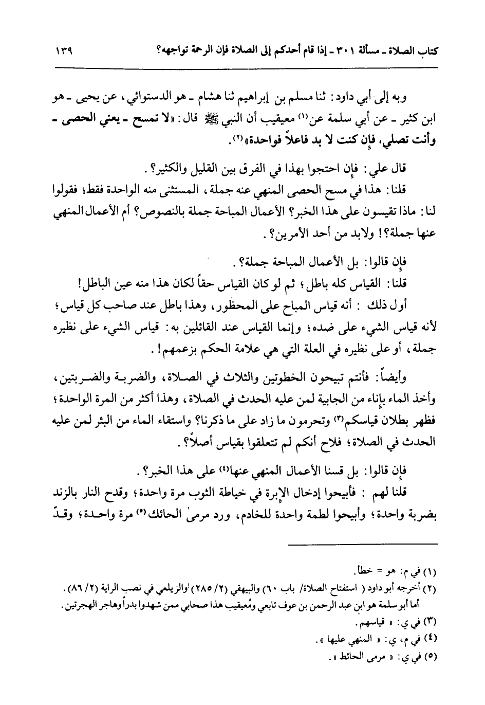 قُلْنَا: هَذَا فِي مَسْحِ الْحَصَى الْمَنْهِيِّ عَنْهُ جُمْلَةً، الْمُسْتَثْنَى مِنْهُ الْوَاحِدَةُ فَقَطْ؛ فَقُولُوا لَنَا: مَاذَا تَقِيسُونَ عَلَى هَذَا الْخَبَرِ؟ الْأَعْمَالَ الْمُبَاحَةَ جُمْلَةً بِالنُّصُوصِ؟ أَمْ الْأَعْمَالَ الْمَنْهِيَّ عَنْهَا جُمْلَةً؟ وَلَا بُدَّ مِنْ أَحَدِ الْأَمْرَيْنِ؟ .