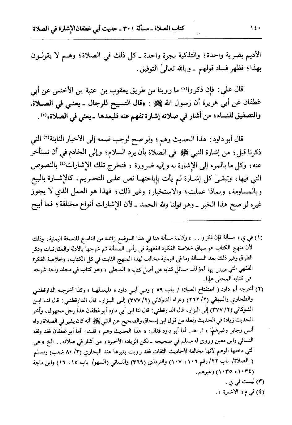قَالَ عَلِيٌّ: فَإِنْ ذَكَرُوا مَا رُوِّينَا مِنْ طَرِيقِ يَعْقُوبَ بْنِ عُتْبَةَ بْنِ الْأَخْنَسِ عَنْ أَبِي غَطَفَانَ عَنْ أَبِي هُرَيْرَةَ أَنَّ رَسُولَ اللَّهِ - صَلَّى اللَّهُ عَلَيْهِ وَسَلَّمَ -: قَالَ «التَّسْبِيحُ لِلرِّجَالِ - يَعْنِي فِي الصَّلَاةِ، وَالتَّصْفِيقُ لِلنِّسَاءِ، مَنْ أَشَارَ فِي صَلَاتِهِ إشَارَةً تُفْهَمُ عَنْهُ فَلْيُعِدْهَا - يَعْنِي فِي الصَّلَاةِ» . قَالَ أَبُو دَاوُد: هَذَا الْحَدِيثُ وَهْمٌ؛