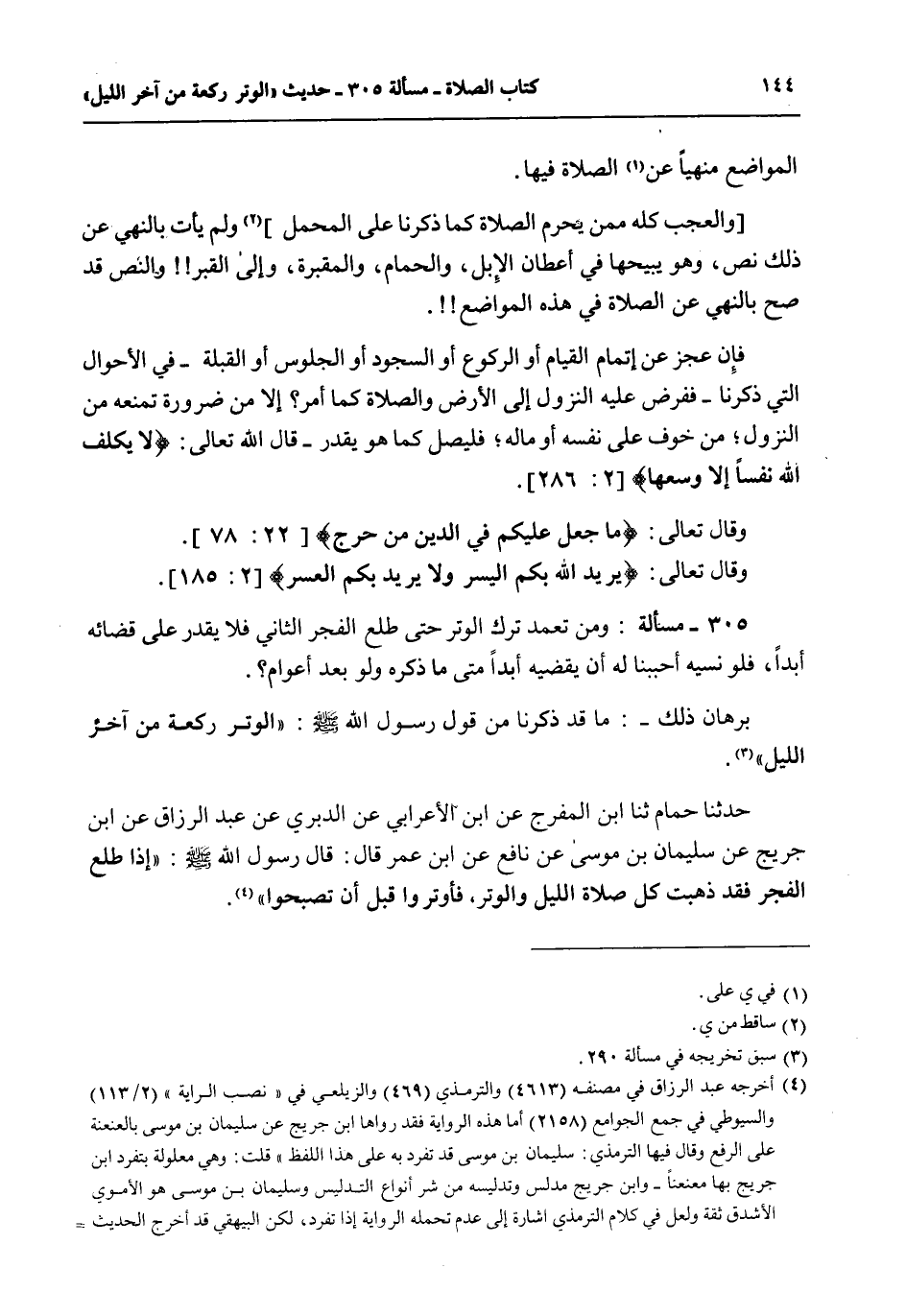 305 - مَسْأَلَةٌ: وَمَنْ تَعَمَّدَ تَرْكَ الْوِتْرِ حَتَّى طَلَعَ الْفَجْرُ الثَّانِي فَلَا يَقْدِرُ عَلَى قَضَائِهِ أَبَدًا، فَلَوْ نَسِيَهُ أَحْبَبْنَا لَهُ أَنْ يَقْضِيَهُ أَبَدًا مَتَى مَا ذَكَرَهُ وَلَوْ بَعْدَ أَعْوَامٍ؟ .