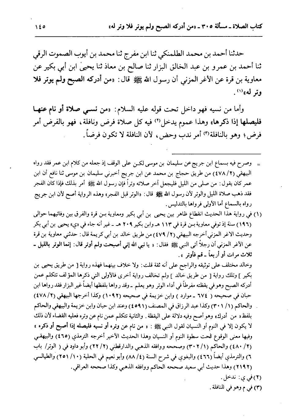 حَدَّثَنَا أَحْمَدُ بْنُ مُحَمَّدٍ الطَّلْمَنْكِيُّ ثنا ابْنُ مُفَرِّجٍ ثنا مُحَمَّدُ بْنُ أَيُّوبَ الصَّمُوتُ الرَّقِّيُّ ثنا أَحْمَدُ بْنُ عَمْرِو بْنُ عَبْدِ الْخَالِقِ الْبَزَّارُ ثنا صَالِحُ بْنُ مُعَاذٍ ثنا يَحْيَى بْنُ أَبِي بُكَيْرٍ عَنْ مُعَاوِيَةَ بْنِ قُرَّةَ عَنْ الْأَغَرِّ الْمُزَنِيِّ أَنَّ رَسُولَ اللَّهِ - صَلَّى اللَّهُ عَلَيْهِ وَسَلَّمَ - قَالَ: «مَنْ أَدْرَكَهُ الصُّبْحُ وَلَمْ يُوتِرْ فَلَا وِتْرَ لَهُ» . وَأَمَّا مَنْ نَسِيَهُ فَهُوَ دَاخِلٌ تَحْتَ قَوْلِهِ - عَلَيْهِ السَّلَامُ -: «مَنْ نَسِيَ صَلَاةً أَوْ نَامَ عَنْهَا فَلْيُصَلِّهَا إذَا ذَكَرَهَا» وَهَذَا عُمُومٌ يَدْخُلُ فِيهِ كُلُّ صَلَاةِ فَرْضٍ وَنَافِلَةٍ، فَهُوَ بِالْفَرْضِ أَمْرُ فَرْضٍ؛ وَهُوَ بِالنَّافِلَةِ أَمْرُ نَدْبٍ وَحَضٍّ؛ لِأَنَّ النَّافِلَةَ لَا تَكُونُ فَرْضًا.