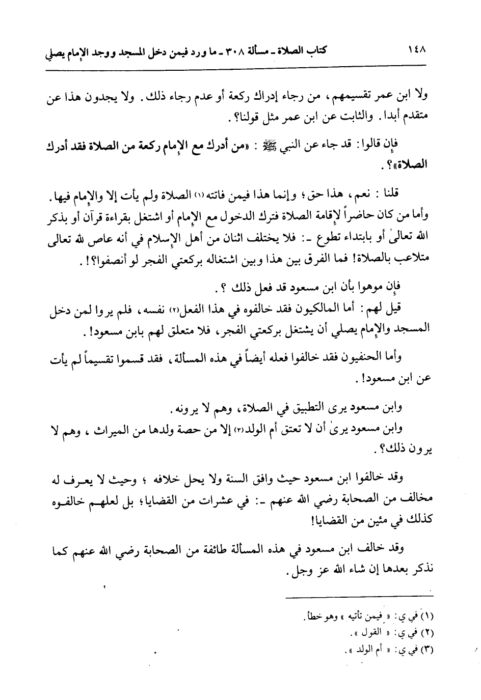 فَإِنْ مَوَّهُوا بِأَنَّ ابْنَ مَسْعُودٍ قَدْ فَعَلَ ذَلِكَ؟ ، قِيلَ لَهُمْ: أَمَّا الْمَالِكِيُّونَ فَقَدْ خَالَفُوهُ فِي هَذَا الْفِعْلِ نَفْسِهِ، فَلَمْ يَرَوْا لِمَنْ دَخَلَ الْمَسْجِدَ، وَالْإِمَامُ يُصَلِّي أَنْ يَشْتَغِلَ بِرَكْعَتَيْ الْفَجْرِ، فَلَا مُتَعَلِّقَ لَهُمْ بِابْنِ مَسْعُودٍ.