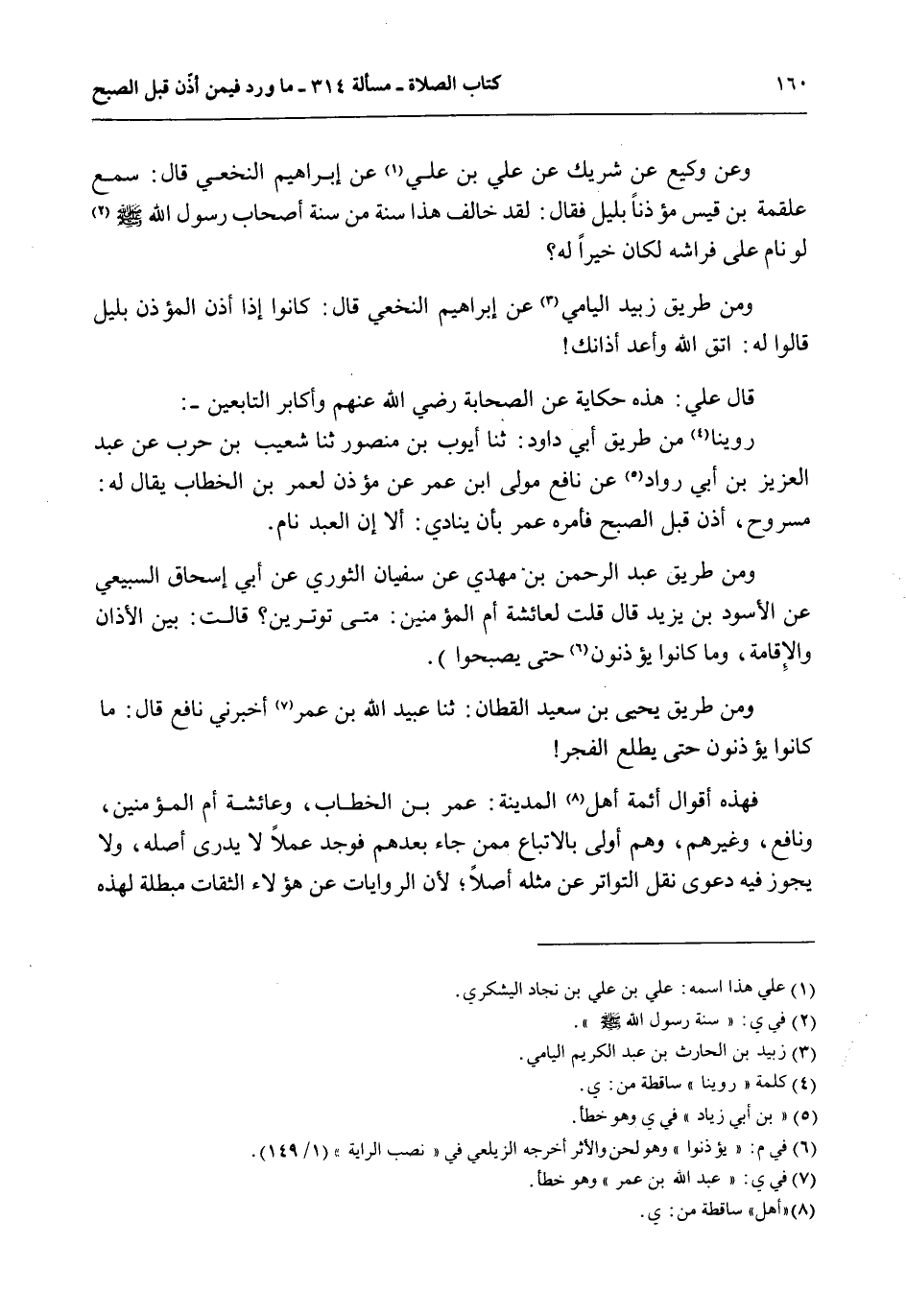 وَعَنْ وَكِيعٍ عَنْ شَرِيكٍ عَنْ عَلِيِّ بْنِ عَلِيٍّ عَنْ إبْرَاهِيمَ النَّخَعِيِّ قَالَ: سَمِعَ عَلْقَمَةُ بْنُ قَيْسٍ مُؤَذِّنًا بِلَيْلٍ فَقَالَ: لَقَدْ خَالَفَ هَذَا سُنَّةً مِنْ سُنَّةِ أَصْحَابِ رَسُولِ اللَّهِ - صَلَّى اللَّهُ عَلَيْهِ وَسَلَّمَ - لَوْ نَامَ عَلَى فِرَاشِهِ لَكَانَ خَيْرًا لَهُ؟ وَمِنْ طَرِيقِ زُبَيْدٍ الْيَامِيِّ عَنْ إبْرَاهِيمَ النَّخَعِيِّ قَالَ: كَانُوا إذَا أَذَّنَ الْمُؤَذِّنُ بِلَيْلِ قَالُوا لَهُ: اتَّقِ اللَّهَ، وَأَعِدْ أَذَانَك قَالَ عَلِيٌّ: هَذِهِ حِكَايَةٌ عَنْ الصَّحَابَةِ - رَضِيَ اللَّهُ عَنْهُمْ -، وَأَكَابِرِ التَّابِعِينَ -: رُوِّينَا مِنْ طَرِيقِ أَبِي دَاوُد: ثنا أَيُّوبُ بْنُ مَنْصُورٍ ثنا شُعَيْبُ بْنُ حَرْبٍ عَنْ عَبْدِ الْعَزِيزِ بْنِ أَبِي رَوَادٍ عَنْ نَافِعٍ مَوْلَى ابْنِ عُمَرَ عَنْ مُؤَذِّنٍ لِعُمَرَ بْنِ الْخَطَّابِ يُقَالُ لَهُ: مَسْرُوحٌ، أَذَّنَ قَبْلَ الصُّبْحِ فَأَمَرَهُ عُمَرُ بِأَنْ يُنَادِيَ: أَلَا إنَّ الْعَبْدَ نَامَ. وَمِنْ طَرِيقِ عَبْدِ الرَّحْمَنِ بْنِ مَهْدِيٍّ عَنْ سُفْيَانَ الثَّوْرِيِّ عَنْ أَبِي إِسْحَاقَ السَّبِيعِيِّ عَنْ الْأَسْوَدِ بْنِ يَزِيدَ قَالَ قُلْت لِعَائِشَةَ أُمِّ الْمُؤْمِنِينَ: مَتَى تُوتِرِينَ؟ قَالَتْ: بَيْنَ الْأَذَانِ وَالْإِقَامَةِ، وَمَا كَانُوا يُؤَذِّنُونَ حَتَّى يُصْبِحُوا.