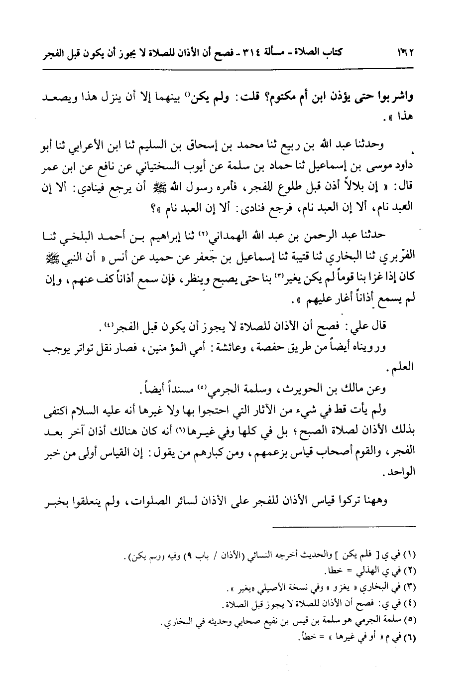 وَعَنْ مَالِكِ بْنِ الْحُوَيْرِثِ، وَسَلَمَةَ الْجَرْمِيِّ مُسْنَدًا أَيْضًا، وَلَمْ يَأْتِ قَطُّ فِي شَيْءٍ مِنْ الْآثَارِ الَّتِي احْتَجُّوا بِهَا، وَلَا غَيْرِهَا أَنَّهُ - عَلَيْهِ السَّلَامُ - اكْتَفَى بِذَلِكَ الْأَذَانِ لِصَلَاةِ الصُّبْحِ؛ بَلْ فِي كُلِّهَا، وَفِي غَيْرِهَا أَنَّهُ كَانَ هُنَالِكَ أَذَانٌ آخَرُ بَعْدَ الْفَجْرِ، وَالْقَوْمُ أَصْحَابُ قِيَاسٍ بِزَعْمِهِمْ، وَمِنْ كِبَارِهِمْ مَنْ يَقُولُ: إنَّ الْقِيَاسَ أَوْلَى مِنْ خَبَرِ الْوَاحِدِ.