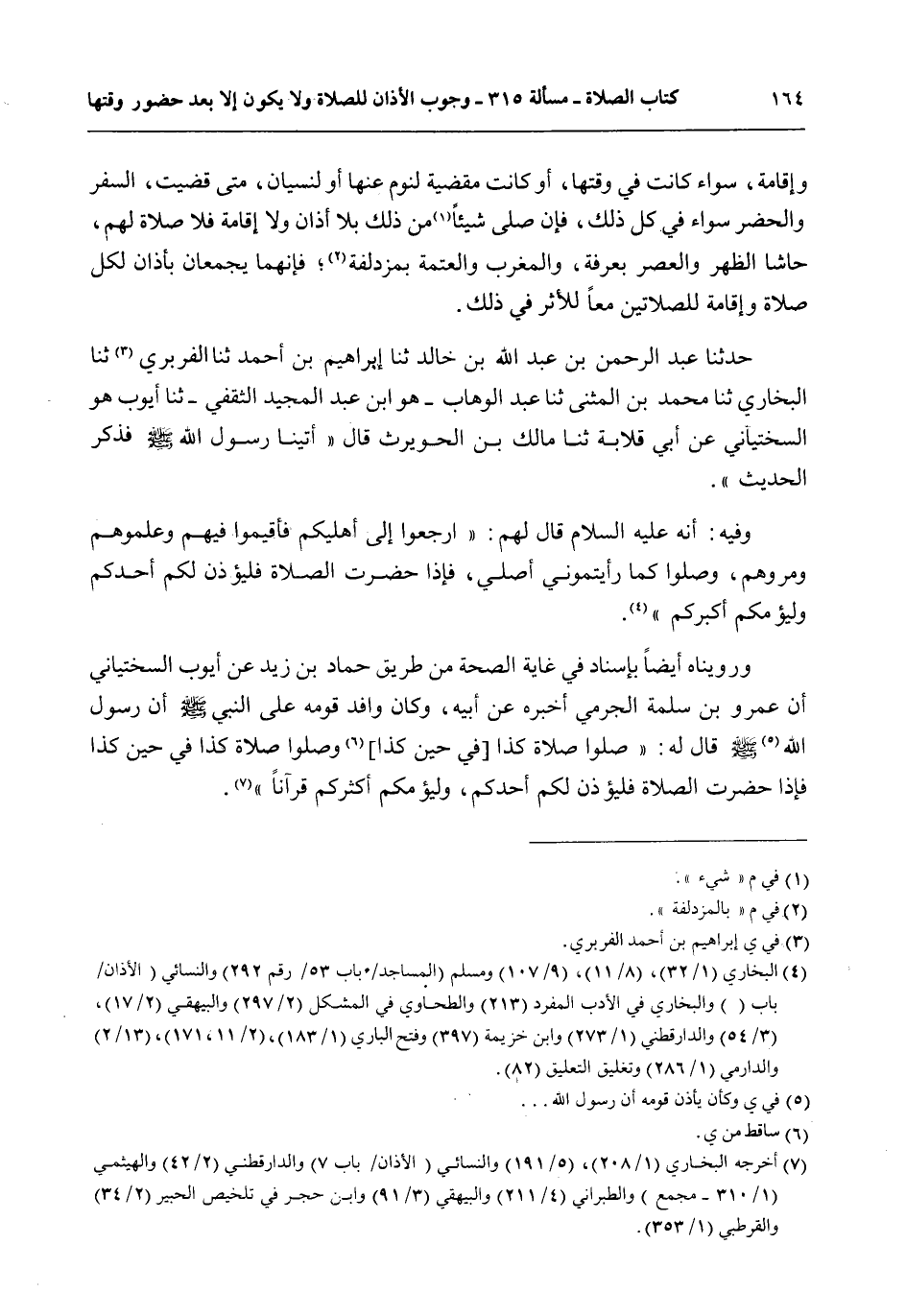 حَدَّثَنَا عَبْدُ الرَّحْمَنِ بْنُ عَبْدِ اللَّهِ بْنِ خَالِدٍ ثنا إبْرَاهِيمُ بْنُ أَحْمَدَ ثنا الْفَرَبْرِيُّ ثنا الْبُخَارِيُّ ثنا مُحَمَّدُ بْنُ الْمُثَنَّى ثنا عَبْدُ الْوَهَّابِ هُوَ ابْنُ عَبْدِ الْمَجِيدِ الثَّقَفِيُّ - ثنا أَيُّوبُ هُوَ السِّخْتِيَانِيُّ عَنْ أَبِي قِلَابَةَ ثنا مَالِكُ بْنُ الْحُوَيْرِثِ قَالَ «أَتَيْنَا رَسُولَ اللَّهِ - صَلَّى اللَّهُ عَلَيْهِ وَسَلَّمَ - فَذَكَرَ الْحَدِيثَ، وَفِيهِ: أَنَّهُ - عَلَيْهِ السَّلَامُ - قَالَ لَهُمْ: ارْجِعُوا إلَى أَهْلِيكُمْ فَأَقِيمُوا فِيهِمْ وَعَلِّمُوهُمْ وَمُرُوهُمْ، وَصَلُّوا كَمَا رَأَيْتُمُونِي أُصَلِّي، فَإِذَا حَضَرَتْ الصَّلَاةُ فَلْيُؤَذِّنْ لَكُمْ أَحَدُكُمْ وَلْيَؤُمَّكُمْ أَكْبَرُكُمْ» .