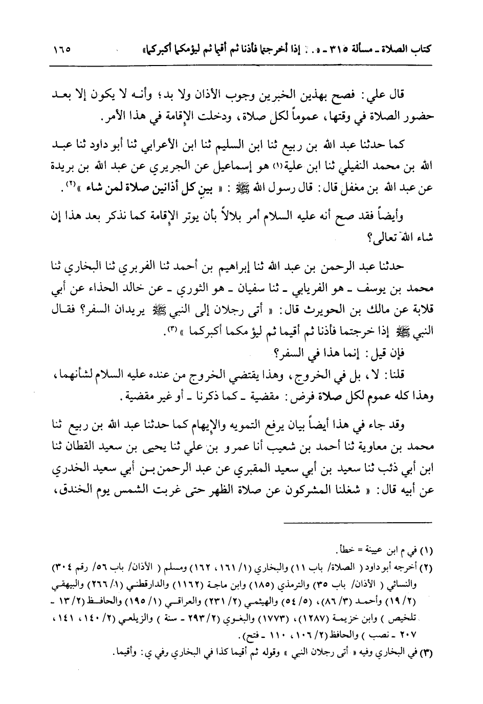 وَقَدْ جَاءَ فِي هَذَا أَيْضًا بَيَانٌ يَرْفَعُ التَّمْوِيهَ وَالْإِيهَامَ كَمَا حَدَّثَنَا عَبْدُ اللَّهِ بْنُ رَبِيعٍ ثنا مُحَمَّدُ بْنُ مُعَاوِيَةَ ثنا أَحْمَدُ بْنُ شُعَيْبٍ أَنَا عَمْرُو بْنُ عَلِيٍّ ثنا يَحْيَى بْنُ سَعِيدٍ الْقَطَّانُ ثنا ابْنُ أَبِي ذِئْبٍ ثنا سَعِيدُ بْنُ أَبِي سَعِيدٍ الْمَقْبُرِيُّ عَنْ عَبْدِ الرَّحْمَنِ بْنِ أَبِي سَعِيدٍ الْخُدْرِيِّ عَنْ أَبِيهِ قَالَ: «شَغَلَنَا الْمُشْرِكُونَ عَنْ صَلَاةِ الظُّهْرِ حَتَّى غَرُبَتْ الشَّمْسُ يَوْمَ الْخَنْدَقِ،