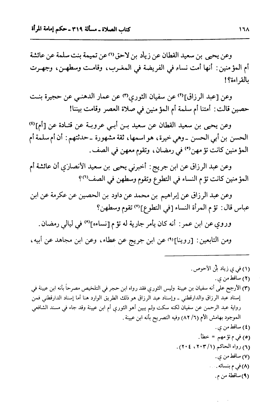 وَعَنْ يَحْيَى بْنِ سَعِيدِ الْقَطَّانِ عَنْ زِيَادِ بْنِ لَاحِقٍ عَنْ تَمِيمَةَ بِنْتِ سَلَمَةَ عَنْ عَائِشَةَ أُمِّ الْمُؤْمِنِينَ: أَنَّهَا أَمَّتْ نِسَاءً فِي الْفَرِيضَةِ فِي الْمَغْرِبِ، وَقَامَتْ وَسَطَهُنَّ، وَجَهَرَتْ بِالْقِرَاءَةِ؟ وَعَنْ [عَبْدِ الرَّزَّاقِ] عَنْ سُفْيَانَ الثَّوْرِيِّ عَنْ عَمَّارِ الدُّهْنِيِّ عَنْ حُجَيْرَةَ بِنْتِ حُصَيْنٍ قَالَتْ: أَمَّتْنَا أُمُّ سَلَمَةَ أُمُّ الْمُؤْمِنِينَ فِي صَلَاةِ الْعَصْرِ، وَقَامَتْ بَيْنَنَا وَعَنْ يَحْيَى بْنِ سَعِيدِ الْقَطَّانِ عَنْ سَعِيدِ بْنُ أَبِي عَرُوبَةَ عَنْ قَتَادَةَ عَنْ أُمِّ الْحَسَنِ بْنِ أَبِي الْحَسَنِ وَهِيَ خَيْرَةُ -، هُوَ اسْمُهَا، ثِقَةٌ مَشْهُورَةٌ - حَدَّثَتْهُمْ: أَنَّ أُمَّ سَلَمَةَ أُمَّ الْمُؤْمِنِينَ كَانَتْ تَؤُمُّهُنَّ فِي رَمَضَانَ، وَتَقُومُ مَعَهُنَّ فِي الصَّفِّ.