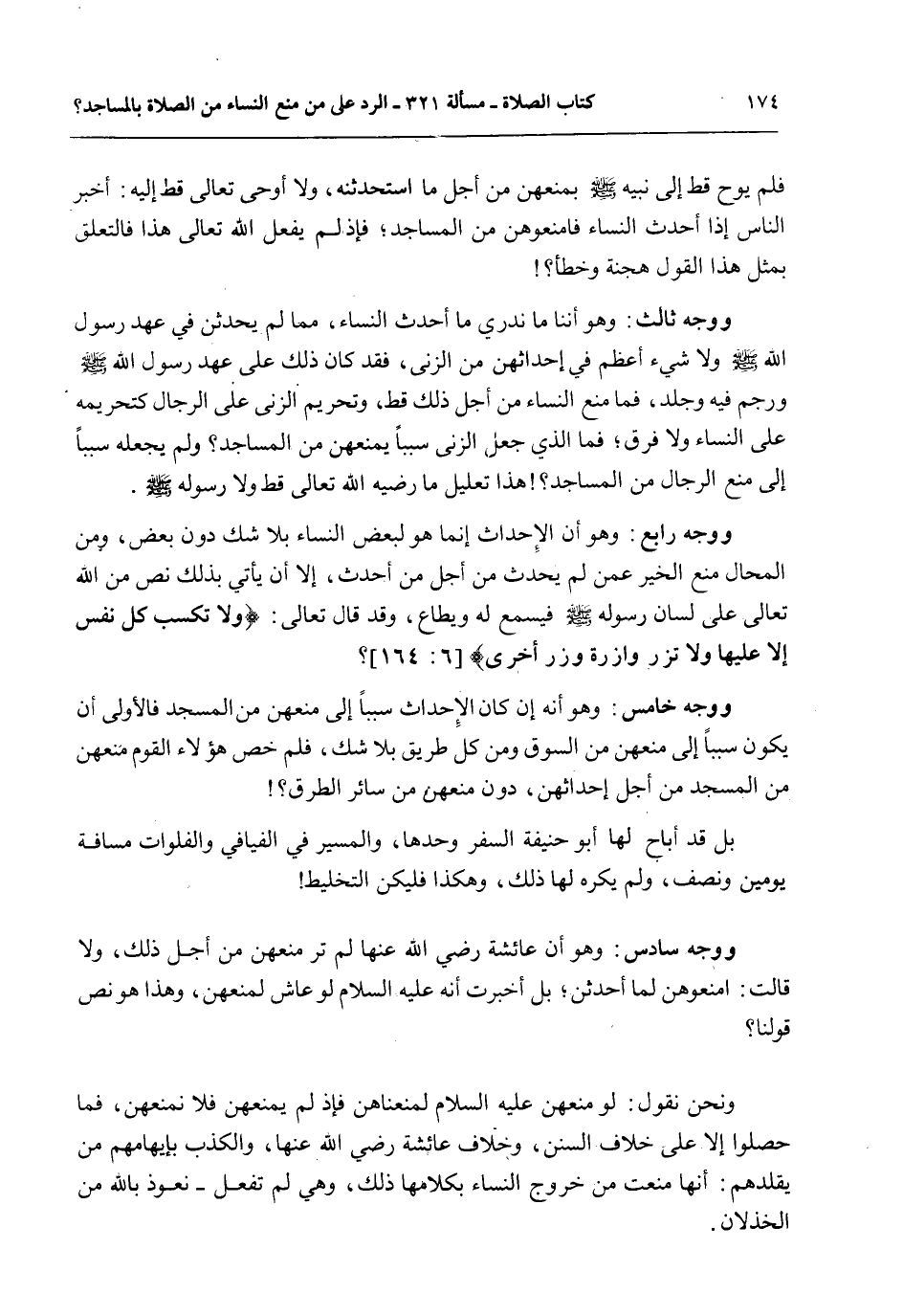 وَوَجْهٌ رَابِعٌ: وَهُوَ أَنَّ الْإِحْدَاثَ إنَّمَا هُوَ لِبَعْضِ النِّسَاءِ بِلَا شَكٍّ دُونَ بَعْضٍ، وَمِنْ الْمُحَالِ مَنْعُ الْخَيْرِ عَمَّنْ لَمْ يُحْدِثْ مِنْ أَجْلِ مَنْ أَحْدَثَ، إلَّا أَنْ يَأْتِيَ بِذَلِكَ نَصٌّ مِنْ اللَّهِ تَعَالَى عَلَى لِسَانِ رَسُولِهِ - صَلَّى اللَّهُ عَلَيْهِ وَسَلَّمَ - فَيُسْمَعُ لَهُ وَيُطَاعُ، وَقَدْ قَالَ تَعَالَى: {وَلا تَكْسِبُ كُلُّ نَفْسٍ إِلا عَلَيْهَا وَلا تَزِرُ وَازِرَةٌ وِزْرَ أُخْرَى} [الأنعام: 164] وَوَجْهٌ خَامِسٌ: وَهُوَ أَنَّهُ إنْ كَانَ الْإِحْدَاثُ سَبَبًا إلَى مَنْعِهِنَّ مِنْ الْمَسْجِدِ فَالْأَوْلَى أَنْ يَكُونَ سَبَبًا إلَى مَنْعِهِنَّ مِنْ السُّوقِ، وَمِنْ كُلِّ طَرِيقٍ بِلَا شَكٍّ، فَلِمَ خَصَّ هَؤُلَاءِ الْقَوْمُ مَنْعَهُنَّ مِنْ الْمَسْجِدِ مِنْ أَجْلِ إحْدَاثِهِنَّ، دُونَ مَنْعِهِنَّ مِنْ سَائِرِ الطُّرُقِ؟ بَلْ قَدْ أَبَاحَ لَهَا أَبُو حَنِيفَةَ السَّفَرَ وَحْدَهَا، وَالْمَسِيرَ فِي الْفَيَافِي وَالْفَلَوَاتِ مَسَافَةَ يَوْمَيْنِ وَنِصْفٍ، وَلَمْ يَكْرَهْ لَهَا ذَلِكَ، وَهَكَذَا فَلْيَكُنْ التَّخْلِيطُ.