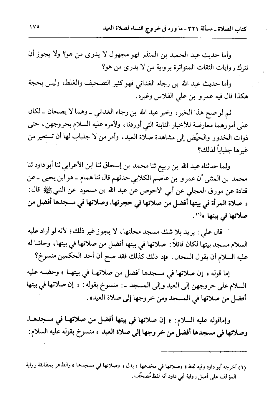 أَمَّا قَوْلُهُ «إنَّ صَلَاتَهَا فِي مَسْجِدِهَا أَفْضَلُ مِنْ صَلَاتِهَا فِي بَيْتِهَا» وَحَضُّهُ - عَلَيْهِ السَّلَامُ - عَلَى خُرُوجِهِنَّ إلَى الْعِيدِ، وَإِلَى الْمَسْجِدِ -: مَنْسُوخٌ بِقَوْلِهِ: «إنَّ صَلَاتَهَا فِي بَيْتِهَا أَفْضَلُ مِنْ صَلَاتِهَا فِي الْمَسْجِدِ» وَمِنْ خُرُوجِهَا إلَى صَلَاةِ الْعِيدِ ".