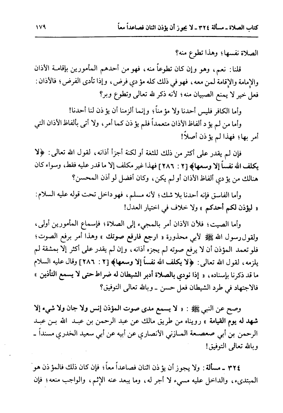 324 - مَسْأَلَةٌ: وَلَا يَجُوزُ أَنْ يُؤَذِّنَ اثْنَانِ فَصَاعِدًا مَعًا؛ فَإِنْ كَانَ ذَلِكَ فَالْمُؤَذِّنُ هُوَ الْمُبْتَدِئُ، وَالدَّاخِلُ عَلَيْهِ مُسِيءٌ لَا أَجْرَ لَهُ، وَمَا يَبْعُدُ عَنْهُ الْإِثْمُ، وَالْوَاجِبُ مَنْعُهُ؛ فَإِنْ