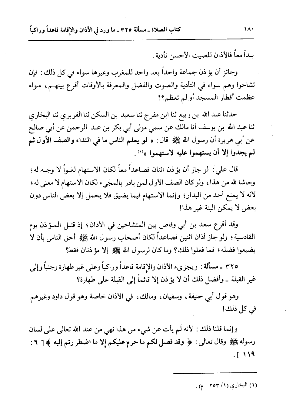 325 - مَسْأَلَةٌ: وَيُجْزِئُ الْأَذَانُ وَالْإِقَامَةُ قَاعِدًا وَرَاكِبًا وَعَلَى غَيْرِ طَهَارَةٍ وَجُنُبًا، وَإِلَى غَيْرِ الْقِبْلَةِ -، وَأَفْضَلُ ذَلِكَ أَنْ لَا يُؤَذِّنَ إلَّا قَائِمًا إلَى الْقِبْلَةِ عَلَى طَهَارَةٍ؟ وَهُوَ قَوْلُ أَبِي حَنِيفَةَ، وَسُفْيَانَ، وَمَالِكٍ، فِي الْأَذَانِ خَاصَّةً وَهُوَ قَوْلُ دَاوُد وَغَيْرِهِمْ فِي كُلِّ ذَلِكَ، وَإِنَّمَا قُلْنَا ذَلِكَ: لِأَنَّهُ لَمْ يَأْتِ عَنْ شَيْءٍ مِنْ هَذَا نَهْيٌ مِنْ عِنْدِ اللَّهِ تَعَالَى عَلَى لِسَانِ رَسُولِهِ - صَلَّى اللَّهُ عَلَيْهِ وَسَلَّمَ - وَقَالَ تَعَالَى: {وَقَدْ فَصَّلَ لَكُمْ مَا حَرَّمَ عَلَيْكُمْ إِلا مَا اضْطُرِرْتُمْ إِلَيْهِ} [الأنعام: 119] .