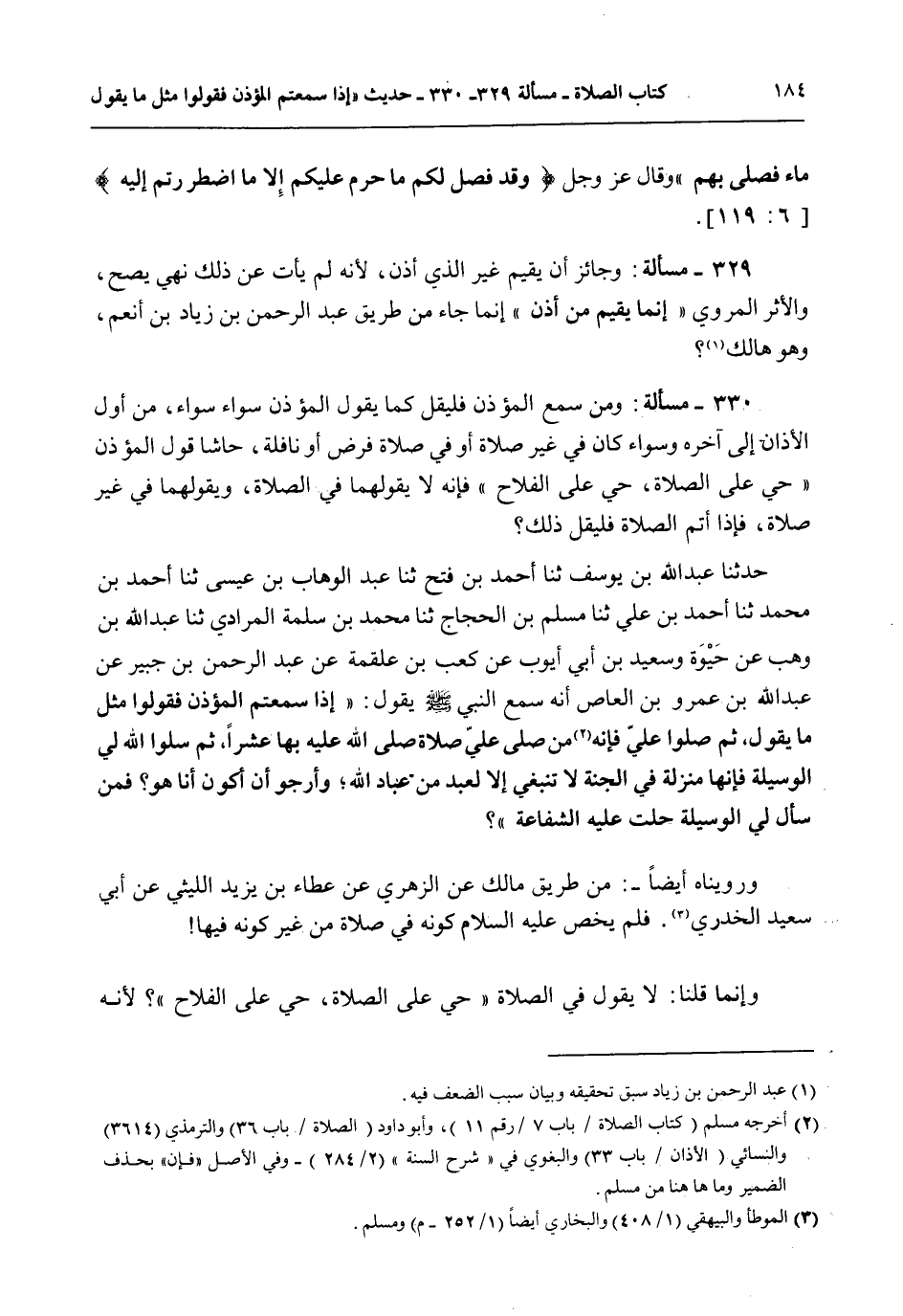 330 - مَسْأَلَةٌ: وَمَنْ سَمِعَ الْمُؤَذِّنَ فَلْيَقُلْ كَمَا يَقُولُ الْمُؤَذِّنُ سَوَاءً سَوَاءً، مِنْ أَوَّلِ الْأَذَانِ إلَى آخِرِهِ، وَسَوَاءٌ كَانَ فِي غَيْرِ صَلَاةٍ أَوْ فِي صَلَاةِ فَرْضٍ أَوْ نَافِلَةٍ، حَاشَا قَوْلِ الْمُؤَذِّنِ " حَيَّ عَلَى الصَّلَاةِ، حَيَّ عَلَى الْفَلَاحِ " فَإِنَّهُ لَا يَقُولُهُمَا فِي الصَّلَاةِ، وَيَقُولُهُمَا فِي غَيْرِ صَلَاةٍ، فَإِذَا أَتَمَّ الصَّلَاةَ فَلْيَقُلْ ذَلِكَ؟ حَدَّثَنَا عَبْدُ اللَّهِ بْنُ يُوسُفَ ثنا أَحْمَدُ بْنُ فَتْحٍ ثنا عَبْدُ الْوَهَّابِ بْنُ عِيسَى ثنا أَحْمَدُ بْنُ مُحَمَّدٍ ثنا أَحْمَدُ بْنُ عَلِيٍّ ثنا مُسْلِمُ بْنُ الْحَجَّاجِ ثنا مُحَمَّدُ بْنُ سَلَمَةَ الْمُرَادِيُّ ثنا عَبْدُ اللَّهِ بْنُ وَهْبٍ عَنْ حَيْوَةُ وَسَعِيدُ بْنُ أَبِي أَيُّوبَ عَنْ كَعْبِ بْنِ عَلْقَمَةَ عَنْ عَبْدِ الرَّحْمَنِ بْنِ جُبَيْرٍ عَنْ عَبْدِ اللَّهِ بْنِ عَمْرِو بْنِ الْعَاصِ أَنَّهُ سَمِعَ النَّبِيَّ - صَلَّى اللَّهُ عَلَيْهِ وَسَلَّمَ - يَقُولُ: «إذَا سَمِعْتُمْ الْمُؤَذِّنَ فَقُولُوا مِثْلَ مَا يَقُولُ، ثُمَّ صَلُّوا عَلَيَّ فَإِنَّهُ مَنْ صَلَّى عَلَيَّ صَلَاةً صَلَّى اللَّهُ عَلَيْهِ بِهَا عَشْرًا، ثُمَّ سَلُوا اللَّهَ لِي الْوَسِيلَةَ فَإِنَّهَا مَنْزِلَةٌ فِي الْجَنَّةِ لَا تَنْبَغِي إلَّا لِعَبْدٍ مِنْ عِبَادِ اللَّهِ وَأَرْجُو أَنْ أَكُونَ أَنَا هُوَ فَمَنْ سَأَلَ لِي الْوَسِيلَةَ حَلَّتْ عَلَيْهِ الشَّفَاعَةُ» ؟ .