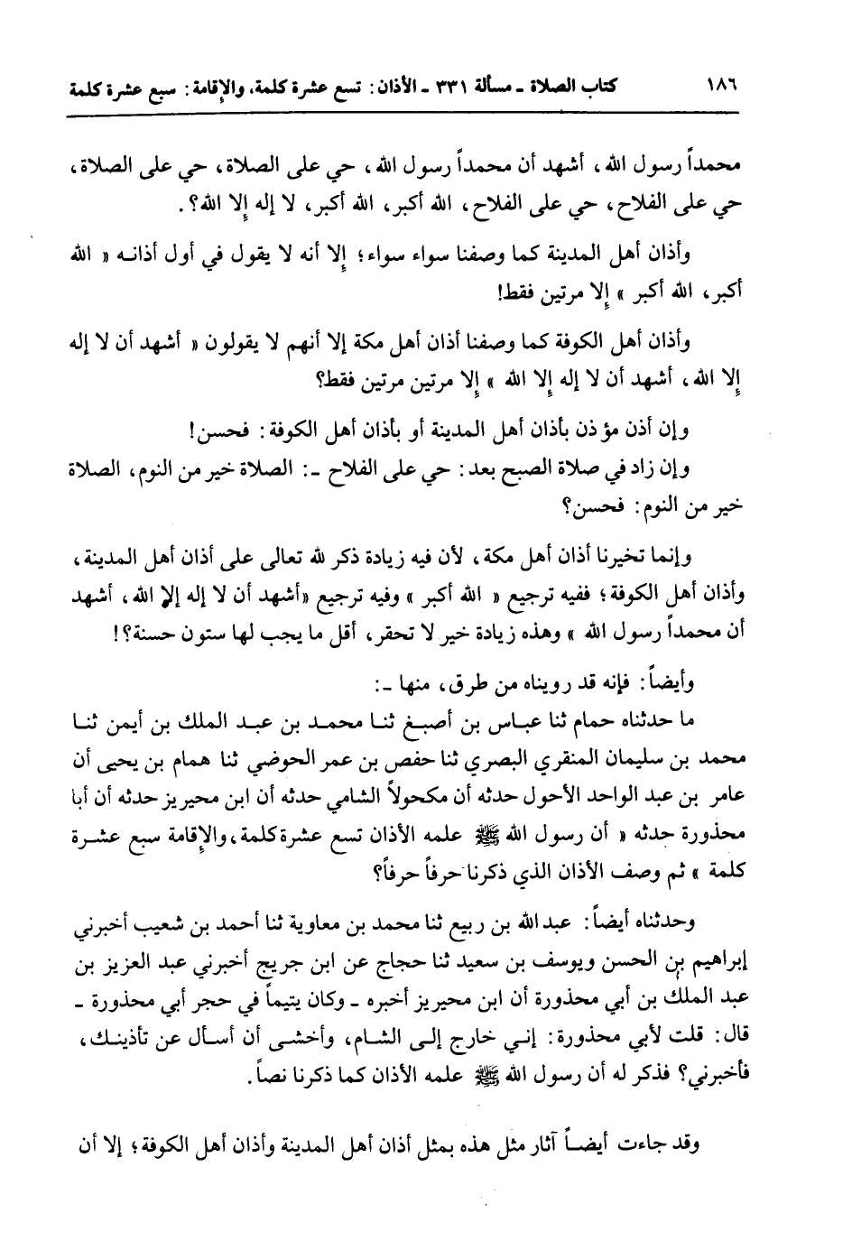 أَقَلُّ مَا يَجِبُ لَهَا سِتُّونَ حَسَنَةً؟ وَأَيْضًا: فَإِنَّهُ قَدْ رُوِّينَاهُ مِنْ طُرُقٍ، مِنْهَا -: مَا حَدَّثَنَاهُ حَمَامُ ثنا عَبَّاسُ بْنُ أَصْبَغَ ثنا مُحَمَّدُ بْنُ عَبْدِ الْمَلِكِ بْنِ أَيْمَنَ ثنا مُحَمَّدُ بْنُ سُلَيْمَانَ الْمُنْقِرِيُّ الْبَصْرِيُّ ثنا حَفْصُ بْنُ عُمَرَ الْحَوْضِيُّ ثنا هَمَّامُ بْنُ يَحْيَى أَنَّ عَامِرَ بْنَ عَبْدِ الْوَاحِدِ الْأَحْوَلَ حَدَّثَهُ أَنَّ مَكْحُولًا الشَّامِيَّ حَدَّثَهُ أَنَّ ابْنَ مُحَيْرِيزٍ حَدَّثَهُ أَنَّ أَبَا مَحْذُورَةَ حَدَّثَهُ «أَنَّ رَسُولَ اللَّهِ - صَلَّى اللَّهُ عَلَيْهِ وَسَلَّمَ - عَلَّمَهُ الْأَذَانَ تِسْعَ عَشْرَةَ كَلِمَةً، وَالْإِقَامَةَ سَبْعَ عَشْرَةَ كَلِمَةً» ثُمَّ وَصَفَ الْأَذَانَ الَّذِي ذَكَرْنَا حَرْفًا حَرْفًا؟ .