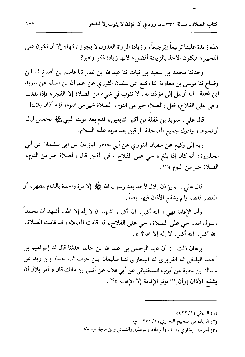 وَحَدَّثَنَا مُحَمَّدُ بْنُ سَعِيدِ بْنِ نُبَاتٍ ثنا عَبْدُ اللَّهِ بْنُ نَصْرٍ ثنا قَاسِمُ بْنُ أَصْبَغَ ثنا ابْنُ وَضَّاحٍ ثنا مُوسَى بْنُ مُعَاوِيَةَ ثنا وَكِيعُ بْنُ سُفْيَانَ الثَّوْرِيُّ عَنْ عِمْرَانَ بْنِ مُسْلِمٍ عَنْ سُوَيْد بْنِ غَفَلَةَ: أَنَّهُ أَرْسَلَ إلَى مُؤَذِّنٍ لَهُ: لَا تُثَوِّبُ فِي شَيْءٍ مِنْ الصَّلَاةِ إلَّا الْفَجْرَ؛ فَإِذَا بَلَغْت " حَيَّ عَلَى الْفَلَاحِ " فَقُلْ " الصَّلَاةُ خَيْرٌ مِنْ النَّوْمِ، الصَّلَاةُ خَيْرٌ مِنْ النَّوْمِ " فَإِنَّهُ أَذَانُ بِلَالٍ.