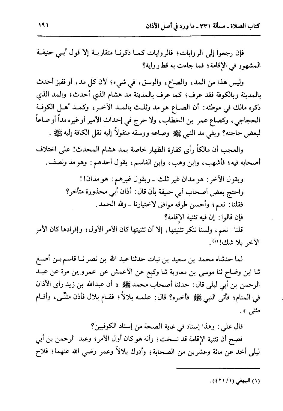 قَالَ عَلِيٌّ: وَهَذَا إسْنَادٌ فِي غَايَةِ الصِّحَّةِ مِنْ إسْنَادِ الْكُوفِيِّينَ؟ فَصَحَّ أَنَّ تَثْنِيَةَ الْإِقَامَةِ قَدْ نُسِخَتْ؛ وَأَنَّهُ هُوَ كَانَ أَوَّلَ الْأَمْرِ؛ وَعَبْدُ الرَّحْمَنِ بْنُ أَبِي لَيْلَى أَخَذَ عَنْ مِائَةٍ وَعِشْرِينَ مِنْ الصَّحَابَةِ؛ وَأَدْرَكَ بِلَالًا وَعُمَرَ - رَضِيَ اللَّهُ عَنْهُمَا -؛ فَلَاحَ