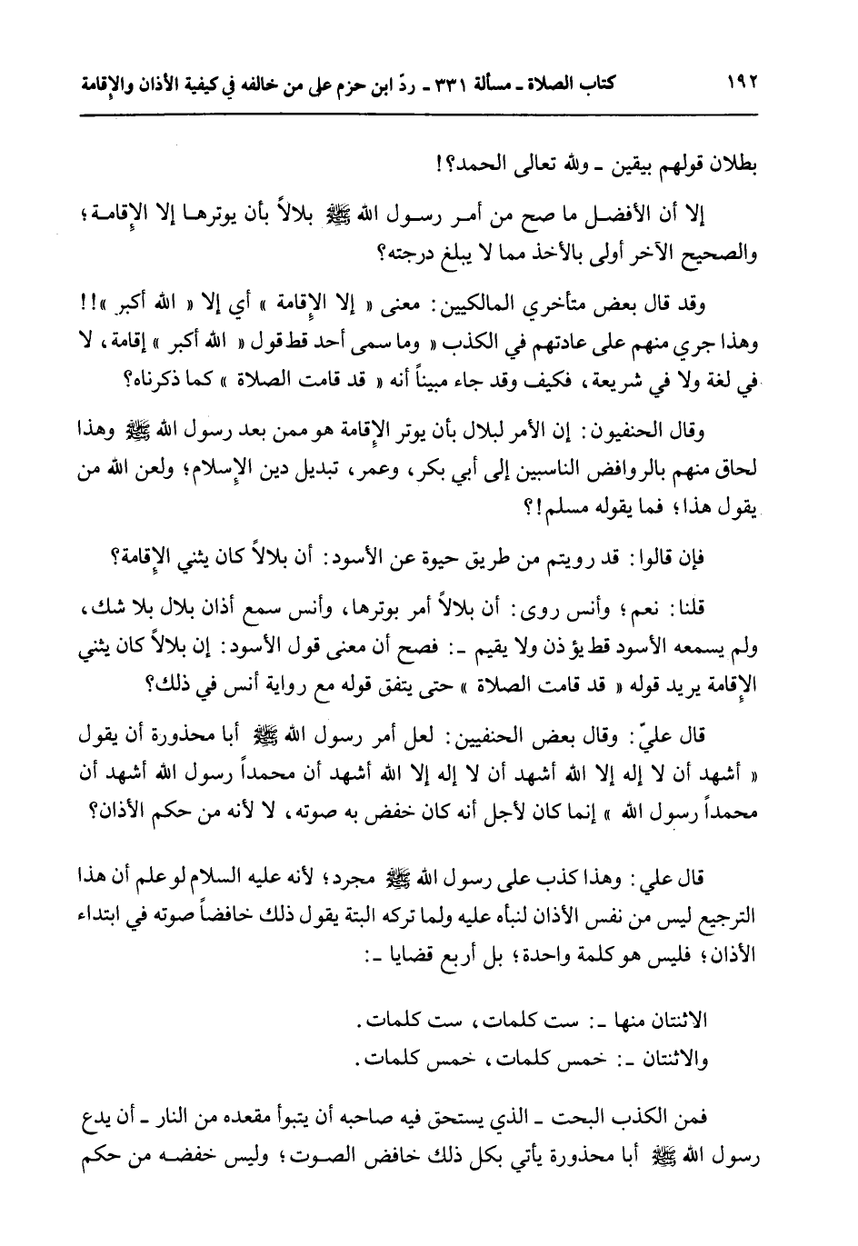 إلَّا أَنَّ الْأَفْضَلَ مَا صَحَّ مِنْ أَمْرِ رَسُولِ اللَّهِ - صَلَّى اللَّهُ عَلَيْهِ وَسَلَّمَ - بِلَالًا بِأَنْ يُوتِرَهَا إلَّا الْإِقَامَةَ؛ وَالصَّحِيحُ الْآخَرُ أَوْلَى بِالْأَخْذِ مِمَّا لَا يَبْلُغُ دَرَجَتَهُ؟ ، وَقَدْ قَالَ بَعْضُ مُتَأَخِّرِي الْمَالِكِيِّينَ: مَعْنَى " إلَّا الْإِقَامَةَ " أَيْ إلَّا " اللَّهُ أَكْبَرُ " وَهَذَا جَرْيٌ مِنْهُمْ عَلَى عَادَتِهِمْ فِي الْكَذِبِ " وَمَا سَمَّى أَحَدٌ قَطُّ قَوْلَ " اللَّهُ أَكْبَرُ " إقَامَةً، لَا فِي لُغَةٍ، وَلَا فِي شَرِيعَةٍ، فَكَيْفَ وَقَدْ جَاءَ مُبَيَّنًا أَنَّهُ " قَدْ قَامَتْ الصَّلَاةُ " كَمَا ذَكَرْنَاهُ؟ وَقَالَ الْحَنَفِيُّونَ: إنَّ الْأَمْرَ لِبِلَالٍ بِأَنْ يُوتِرَ الْإِقَامَةَ هُوَ مِمَّنْ بَعْدَ رَسُولِ اللَّهِ - صَلَّى اللَّهُ عَلَيْهِ وَسَلَّمَ - وَهَذَا لِحَاقٌ مِنْهُمْ بِالرَّوَافِضِ النَّاسِبِينَ إلَى أَبِي بَكْرٍ، وَعُمَرَ، تَبْدِيلَ دَيْنِ الْإِسْلَامِ؛ وَلَعَنَ اللَّهُ مَنْ يَقُولُ هَذَا؛ فَمَا يَقُولُهُ مُسْلِمٌ؟ فَإِنْ قَالُوا: قَدْ رَوَيْتُمْ مِنْ طَرِيقِ حَيْوَةُ عَنْ الْأَسْوَدِ: أَنَّ بِلَالًا كَانَ يُثَنِّي الْإِقَامَةَ؟ قُلْنَا: نَعَمْ؛ وَأَنَسٌ رَوَى: أَنَّ بِلَالًا أَمَرَ بِوِتْرِهَا، وَأَنَسٌ سَمِعَ أَذَانَ بِلَالٍ بِلَا شَكٍّ، وَلَمْ يَسْمَعْهُ الْأَسْوَدُ قَطُّ يُؤَذِّنُ، وَلَا يُقِيمُ -: فَصَحَّ أَنَّ مَعْنَى قَوْلِ الْأَسْوَدِ: إنَّ بِلَالًا كَانَ يُثَنِّي الْإِقَامَةَ يُرِيدُ قَوْلَهُ " قَدْ قَامَتْ الصَّلَاةُ " حَتَّى يَتَّفِقَ قَوْلُهُ مَعَ رِوَايَةِ أَنَسٍ فِي ذَلِكَ؟ .