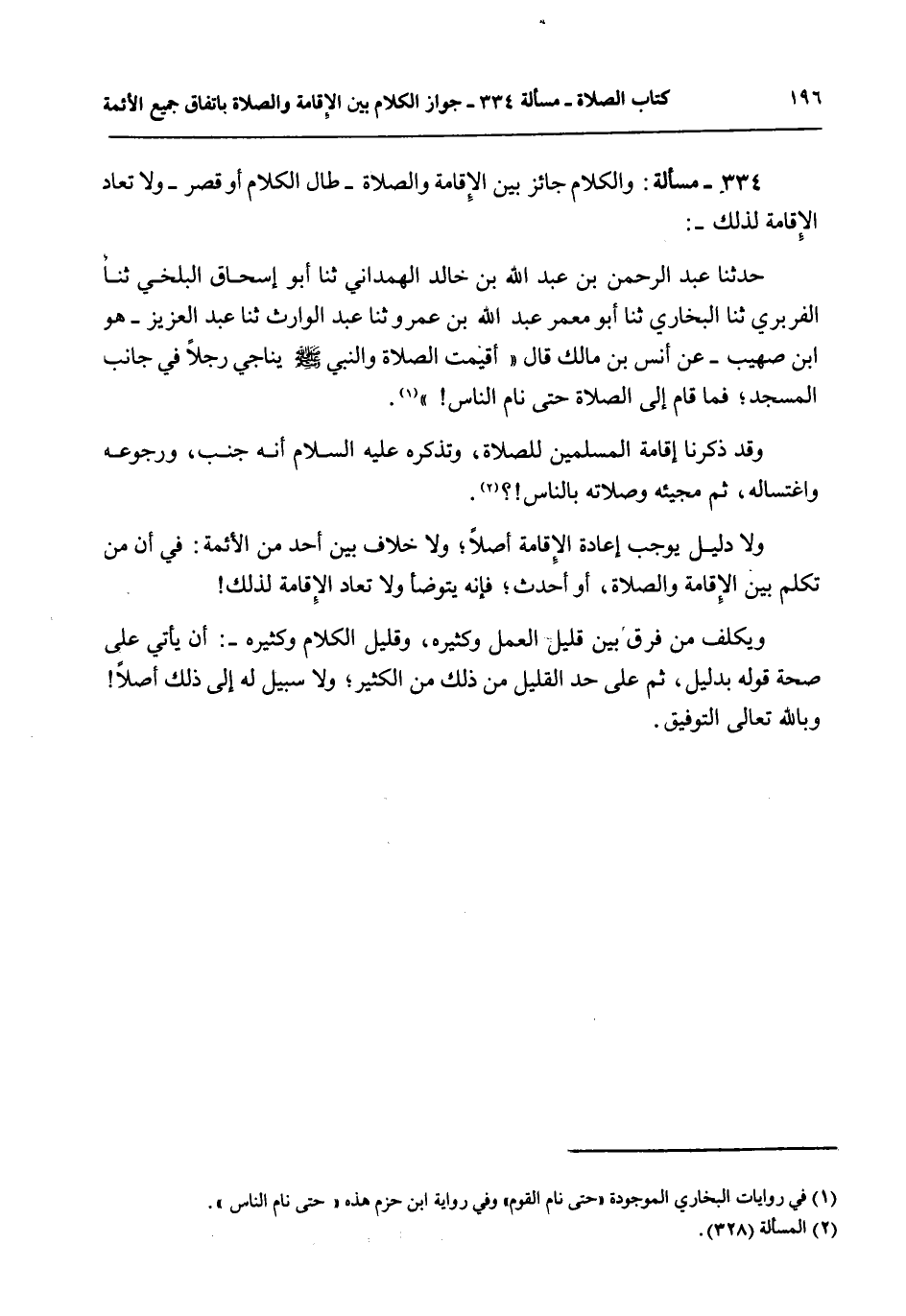 مَسْأَلَةٌ: وَالْكَلَامُ جَائِزٌ بَيْنَ الْإِقَامَةِ وَالصَّلَاةِ - طَالَ الْكَلَامُ أَوْ قَصُرَ - وَلَا تُعَادُ الْإِقَامَةُ لِذَلِكَ -: حَدَّثَنَا عَبْدُ الرَّحْمَنِ بْنُ عَبْدِ اللَّهِ بْنِ خَالِدٍ الْهَمْدَانِيُّ ثنا أَبُو إِسْحَاقَ الْبَلْخِيُّ ثنا الْفَرَبْرِيُّ ثنا الْبُخَارِيُّ ثنا أَبُو مَعْمَرٍ عَبْدُ اللَّهِ بْنُ عَمْرٍو ثنا عَبْدُ الْوَارِثِ ثنا عَبْدُ الْعَزِيزِ هُوَ ابْنُ صُهَيْبٍ - عَنْ أَنَسِ بْنِ مَالِكٍ قَالَ «أُقِيمَتْ الصَّلَاةُ وَالنَّبِيُّ - صَلَّى اللَّهُ عَلَيْهِ وَسَلَّمَ - يُنَاجِي رَجُلًا فِي جَانِبِ الْمَسْجِدِ، فَمَا قَامَ إلَى الصَّلَاةِ حَتَّى نَامَ النَّاسُ» .
