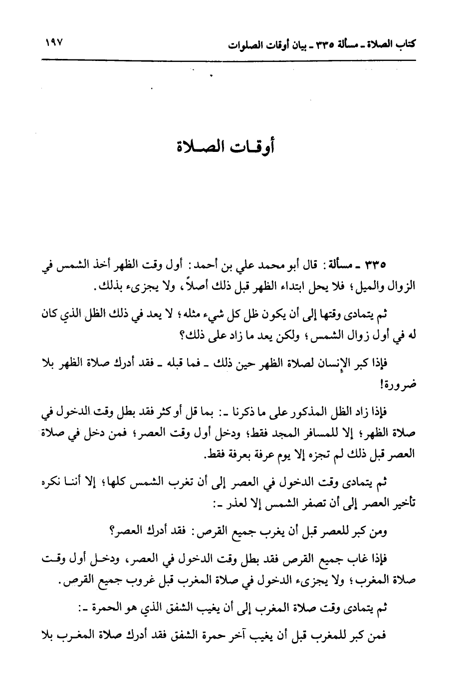 مَسْأَلَةٌ: قَالَ أَبُو مُحَمَّدٍ عَلِيُّ بْنُ أَحْمَدَ: أَوَّلُ وَقْتِ الظُّهْرِ أَخْذُ الشَّمْسِ فِي الزَّوَالِ وَالْمَيْلِ؛ فَلَا يَحِلُّ ابْتِدَاءُ الظُّهْرِ قَبْلَ ذَلِكَ أَصْلًا، وَلَا يُجْزِئُ بِذَلِكَ، ثُمَّ يَتَمَادَى وَقْتُهَا إلَى أَنْ يَكُونَ ظِلُّ كُلِّ شَيْءٍ مِثْلَهُ؛ لَا يُعَدُّ فِي ذَلِكَ الظِّلُّ الَّذِي كَانَ لَهُ فِي أَوَّلِ زَوَالِ الشَّمْسِ؛ وَلَكِنْ مَا زَادَ عَلَى ذَلِكَ؟ فَإِذَا كَبَّرَ الْإِنْسَانُ لِصَلَاةِ الظُّهْرِ حِينَ ذَلِكَ - فَمَا قَبْلَهُ - فَقَدْ أَدْرَكَ صَلَاةَ الظُّهْرِ بِلَا ضَرُورَةٍ فَإِذَا زَادَ الظِّلُّ الْمَذْكُورُ عَلَى مَا ذَكَرْنَا -: بِمَا قَلَّ أَوْ كَثُرَ فَقَدْ بَطَلَ وَقْتُ الدُّخُولِ فِي صَلَاةِ الظُّهْرِ؛ إلَّا لِلْمُسَافِرِ الْمُجِدِّ فَقَطْ؛ وَدَخَلَ أَوَّلُ وَقْتِ الْعَصْرِ؛ فَمَنْ دَخَلَ فِي صَلَاةِ الْعَصْرِ قَبْلَ ذَلِكَ لَمْ تَجْزِهِ إلَّا يَوْمَ عَرَفَةَ بِعَرَفَةَ فَقَطْ، ثُمَّ يَتَمَادَى وَقْتُ الدُّخُولِ فِي الْعَصْرِ إلَى أَنْ تَغْرُبَ الشَّمْسُ كُلُّهَا؛ إلَّا أَنَّنَا نَكْرَهُ تَأْخِيرَ الْعَصْرِ إلَى أَنْ تَصْفَرَّ الشَّمْسُ إلَّا لِعُذْرٍ -: وَمَنْ كَبَّرَ لِلْعَصْرِ قَبْلَ أَنْ يَغْرُبَ جَمِيعُ الْقُرْصِ: فَقَدْ أَدْرَكَ الْعَصْرَ؟ فَإِذَا غَابَ جَمِيعُ الْقُرْصِ فَقَدْ بَطَلَ وَقْتُ الدُّخُولِ فِي الْعَصْرِ، وَدَخَلَ أَوَّلُ وَقْتِ صَلَاةِ الْمَغْرِبِ؛ وَلَا يُجْزِئُ الدُّخُولُ فِي صَلَاةِ الْمَغْرِبِ قَبْلَ غُرُوبِ جَمِيعِ الْقُرْصِ.