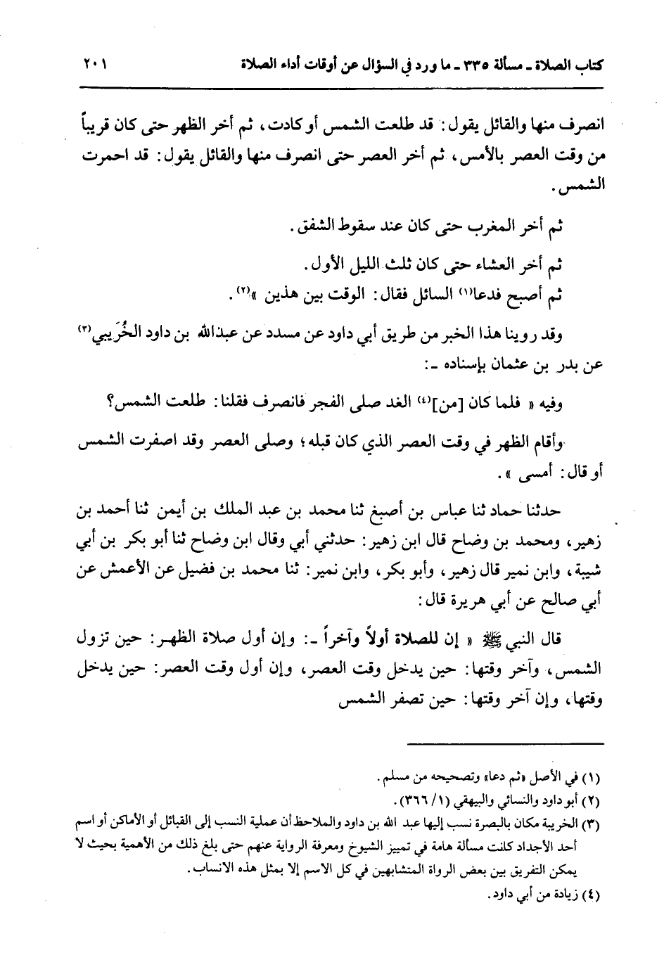 وَقَدْ رُوِّينَا هَذَا الْخَبَرَ مِنْ طَرِيقِ أَبِي دَاوُد عَنْ مُسَدَّدٍ عَنْ عَبْدِ اللَّهِ بْنِ دَاوُد الْخُرَيْبِيِّ عَنْ بَدْرِ بْنِ عُثْمَانَ بِإِسْنَادِهِ -: وَفِيهِ «فَلَمَّا كَانَ مِنْ الْغَدِ صَلَّى الْفَجْرَ فَانْصَرَفَ فَقُلْنَا: طَلَعَتْ الشَّمْسُ؟ وَأَقَامَ الظُّهْرَ فِي وَقْتِ الْعَصْرِ الَّذِي كَانَ قَبْلَهُ، وَصَلَّى الْعَصْرَ وَقَدْ اصْفَرَّتْ الشَّمْسُ أَوْ قَالَ: أَمْسَى» .