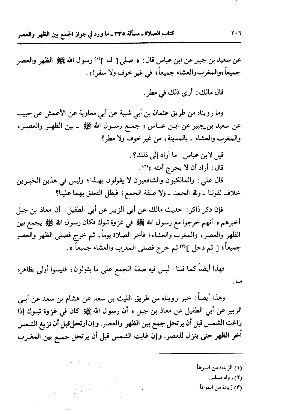 قَالَ عَلِيٌّ: وَالْمَالِكِيُّونَ وَالشَّافِعِيُّونَ لَا يَقُولُونَ بِهَذَا؛ وَلَيْسَ فِي هَذَيْنِ الْخَبَرَيْنِ خِلَافٌ لِقَوْلِنَا - وَلِلَّهِ الْحَمْدُ - وَلَا صِفَةُ الْجَمْعِ؛ فَبَطَلَ التَّعَلُّقُ بِهِمَا عَلَيْنَا؟ فَإِنْ ذَكَرَ ذَاكِرٌ: حَدِيثَ مَالِكٍ عَنْ أَبِي الزُّبَيْرِ عَنْ أَبِي الطُّفَيْلِ: أَنَّ مُعَاذَ بْنَ جَبَلٍ أَخْبَرَهُمْ «أَنَّهُمْ خَرَجُوا مَعَ رَسُولِ اللَّهِ - صَلَّى اللَّهُ عَلَيْهِ وَسَلَّمَ - فِي غَزْوَةِ تَبُوكَ فَكَانَ رَسُولُ اللَّهِ - صَلَّى اللَّهُ عَلَيْهِ وَسَلَّمَ - يَجْمَعُ بَيْنَ الظُّهْرِ وَالْعَصْرِ، وَالْمَغْرِبِ وَالْعِشَاءِ؛ فَأَخَّرَ الصَّلَاةَ يَوْمًا، ثُمَّ خَرَجَ فَصَلَّى الظُّهْرَ وَالْعَصْرَ جَمِيعًا؛ ثُمَّ دَخَلَ ثُمَّ خَرَجَ فَصَلَّى الْمَغْرِبَ وَالْعِشَاءَ جَمِيعًا» .