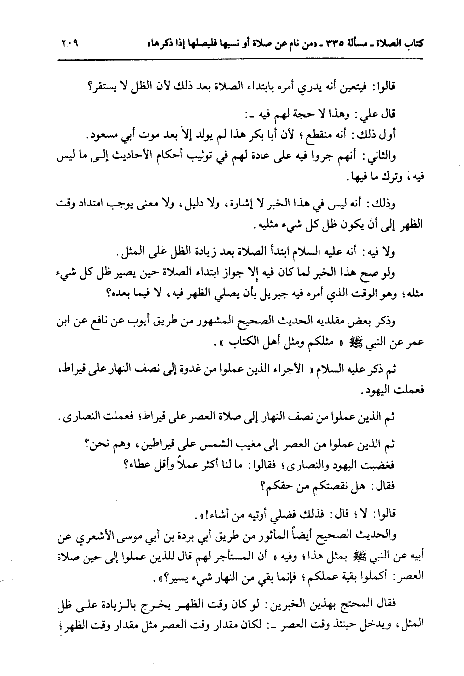 وَلَوْ صَحَّ هَذَا الْخَبَرُ لَمَا كَانَ فِيهِ إلَّا جَوَازُ ابْتِدَاءِ الصَّلَاةِ حِينَ يَصِيرُ ظِلُّ كُلِّ شَيْءٍ مِثْلَهُ؛ وَهُوَ الْوَقْتُ الَّذِي أَمَرَهُ فِيهِ جِبْرِيلُ بِأَنْ يُصَلِّيَ الظُّهْرَ فِيهِ، لَا فِيمَا بَعْدَهُ؟ وَذَكَرَ بَعْضُ مُقَلِّدِيهِ الْحَدِيثَ الصَّحِيحَ الْمَشْهُورَ مِنْ طَرِيقِ أَيُّوبَ عَنْ نَافِعٍ عَنْ ابْنِ عُمَرَ عَنْ النَّبِيِّ - صَلَّى اللَّهُ عَلَيْهِ وَسَلَّمَ - «مَثَلُكُمْ وَمَثَلُ أَهْلِ الْكِتَابِ، ثُمَّ ذَكَرَ - عَلَيْهِ السَّلَامُ - الْأُجَرَاءَ الَّذِينَ عَمِلُوا مِنْ غَدْوَةٍ إلَى نِصْفِ النَّهَارِ عَلَى قِيرَاطٍ، فَعَمِلَتْ الْيَهُودُ، ثُمَّ الَّذِينَ عَمِلُوا مِنْ نِصْفِ النَّهَارِ إلَى صَلَاةِ الْعَصْرِ عَلَى قِيرَاطٍ؛ فَعَمِلَتْ النَّصَارَى، ثُمَّ الَّذِينَ عَمِلُوا مِنْ الْعَصْرِ إلَى مَغِيبِ الشَّمْسِ عَلَى قِيرَاطَيْنِ، وَهُمْ نَحْنُ؟ فَغَضِبَتْ الْيَهُودُ وَالنَّصَارَى؛ فَقَالُوا: مَا لَنَا أَكْثَرُ عَمَلًا وَأَقَلُّ عَطَاءً؟ فَقَالَ: هَلْ نَقَصْتُكُمْ مِنْ حَقِّكُمْ؟ قَالُوا: لَا؛ قَالَ: فَذَلِكَ فَضْلِي أُوتِيهِ مَنْ أَشَاءُ» .