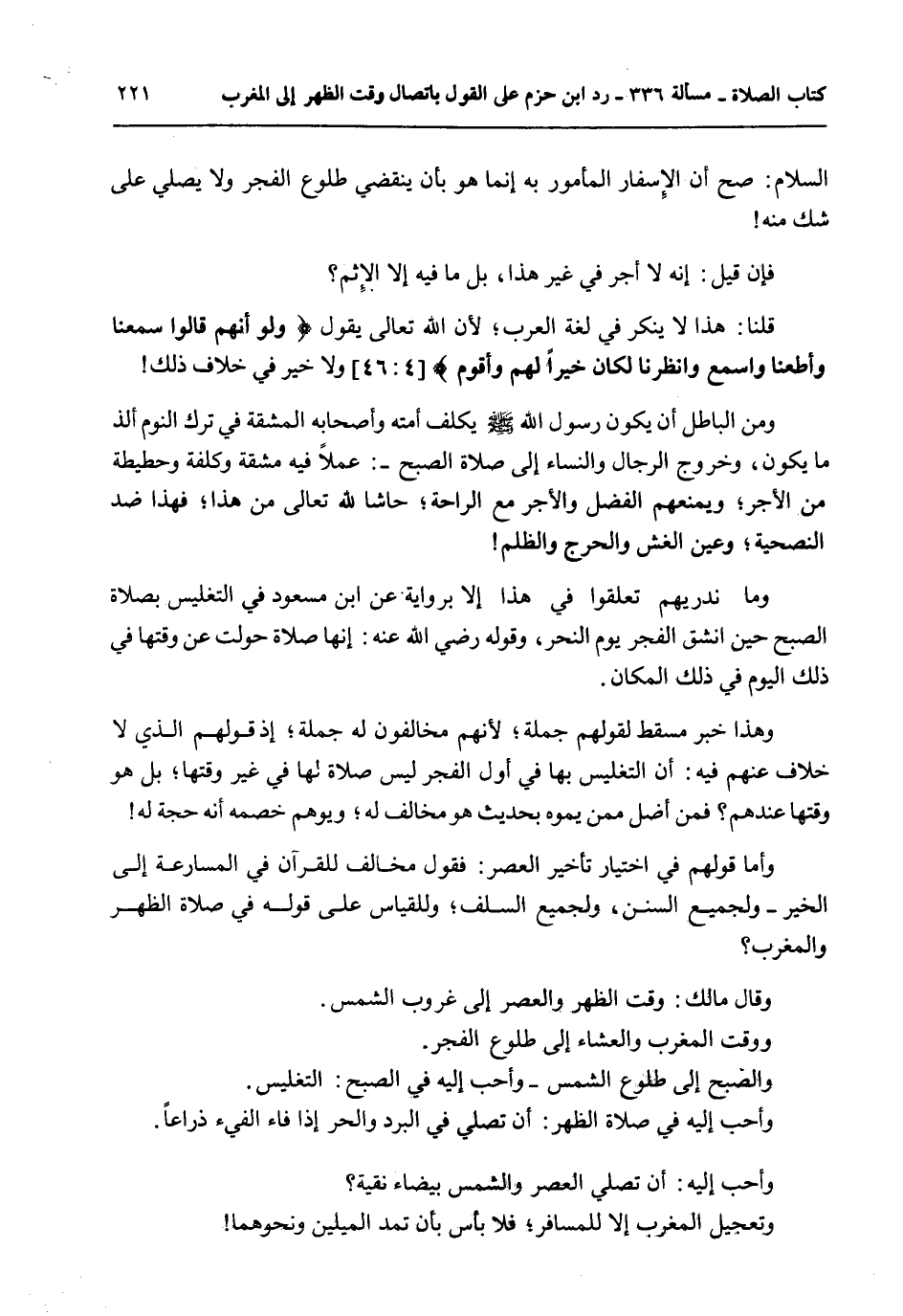 صَحَّ أَنَّ الْإِسْفَارَ الْمَأْمُورَ بِهِ إنَّمَا هُوَ بِأَنْ يَنْقَضِيَ طُلُوعُ الْفَجْرِ وَلَا يُصَلِّيَ عَلَى شَكٍّ مِنْهُ فَإِنْ قِيلَ: إنَّهُ لَا أَجْرَ فِي غَيْرِ هَذَا، بَلْ مَا فِيهِ إلَّا الْإِثْمُ؟ قُلْنَا: هَذَا لَا يُنْكَرُ فِي لُغَةِ الْعَرَبِ؛ لِأَنَّ اللَّهَ تَعَالَى يَقُولُ {وَلَوْ أَنَّهُمْ قَالُوا سَمِعْنَا وَأَطَعْنَا وَاسْمَعْ وَانْظُرْنَا لَكَانَ خَيْرًا لَهُمْ وَأَقْوَمَ} [النساء: 46] وَلَا خَيْرَ فِي خِلَافِ ذَلِكَ وَمِنْ الْبَاطِلِ أَنْ يَكُونَ رَسُولُ اللَّهِ - صَلَّى اللَّهُ عَلَيْهِ وَسَلَّمَ - يُكَلِّفُ أُمَّتَهُ وَأَصْحَابَهُ الْمَشَقَّةَ فِي تَرْكِ النَّوْمِ أَلَذَّ مَا يَكُونُ، وَخُرُوجُ الرِّجَالِ وَالنِّسَاءِ إلَى صَلَاةِ الصُّبْحِ -: عَمَلًا فِيهِ مَشَقَّةٌ وَكُلْفَةٌ وَحَطِيطَةٌ مِنْ الْأَجْرِ؛ وَيَمْنَعُهُمْ الْفَضْلَ وَالْأَجْرَ مَعَ الرَّاحَةِ؛ حَاشَا لِلَّهِ تَعَالَى مِنْ هَذَا؛ فَهَذَا ضِدُّ النَّصِيحَةِ، وَعَيْنُ الْغِشِّ وَالْحَرَجِ وَالظُّلْمِ.