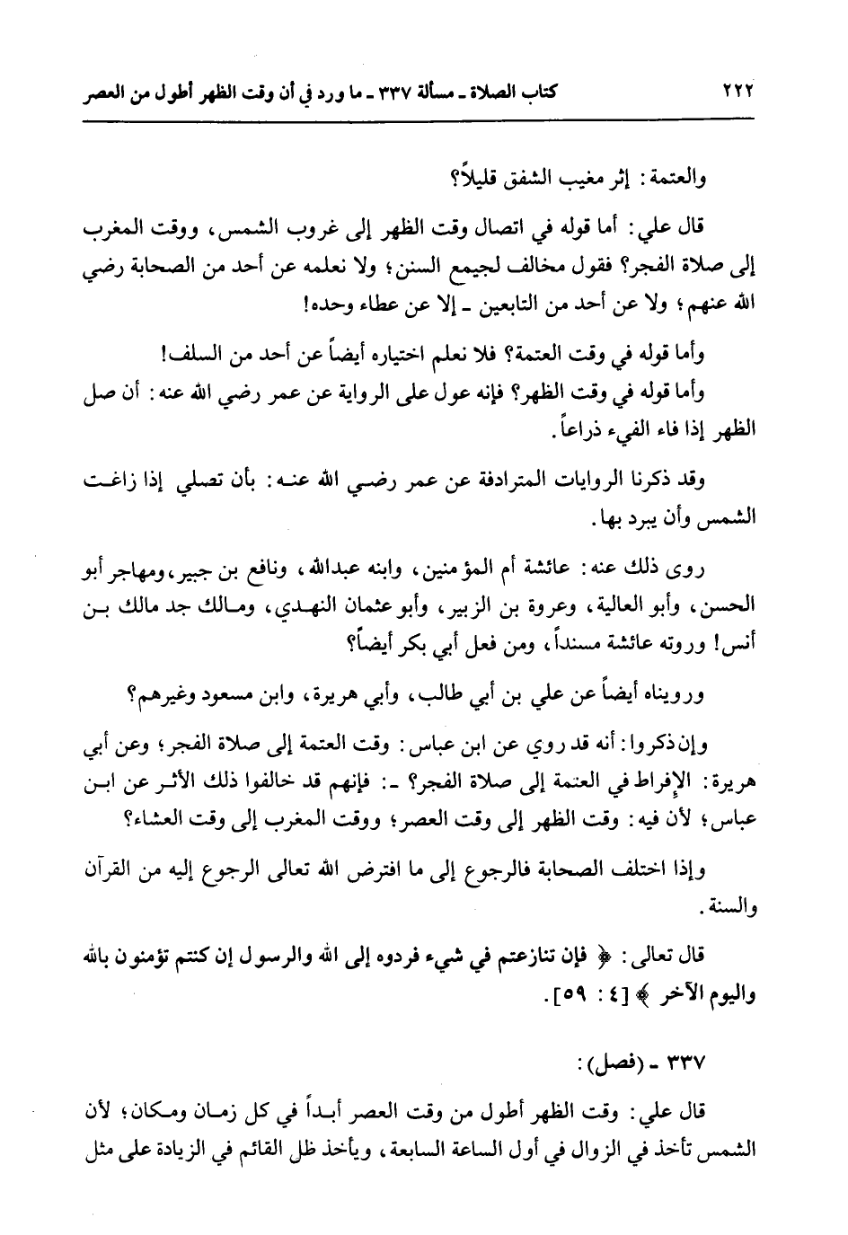 337 - مَسْأَلَةٌ: قَالَ عَلِيٌّ: وَقْتُ الظُّهْرِ أَطْوَلُ مِنْ وَقْتِ الْعَصْرِ أَبَدًا فِي كُلِّ زَمَانٍ وَمَكَانٍ؛ لِأَنَّ الشَّمْسَ تَأْخُذُ فِي الزَّوَالِ فِي أَوَّلِ السَّاعَةِ السَّابِعَةِ، وَيَأْخُذُ ظِلُّ الْقَائِمِ فِي الزِّيَادَةِ عَلَى مِثْلِ